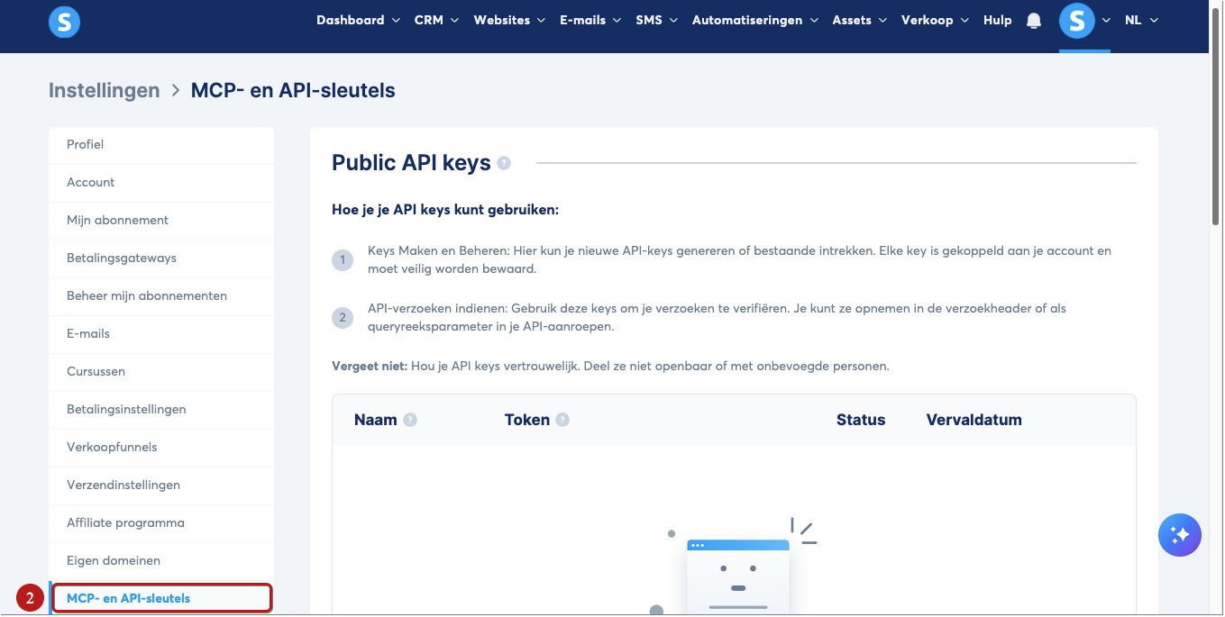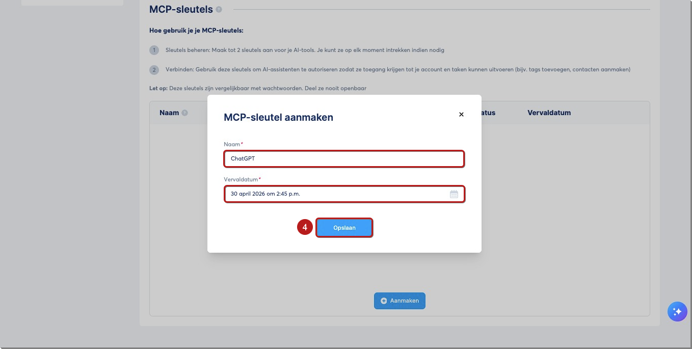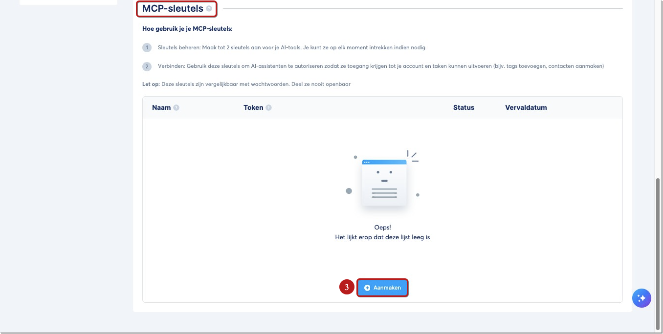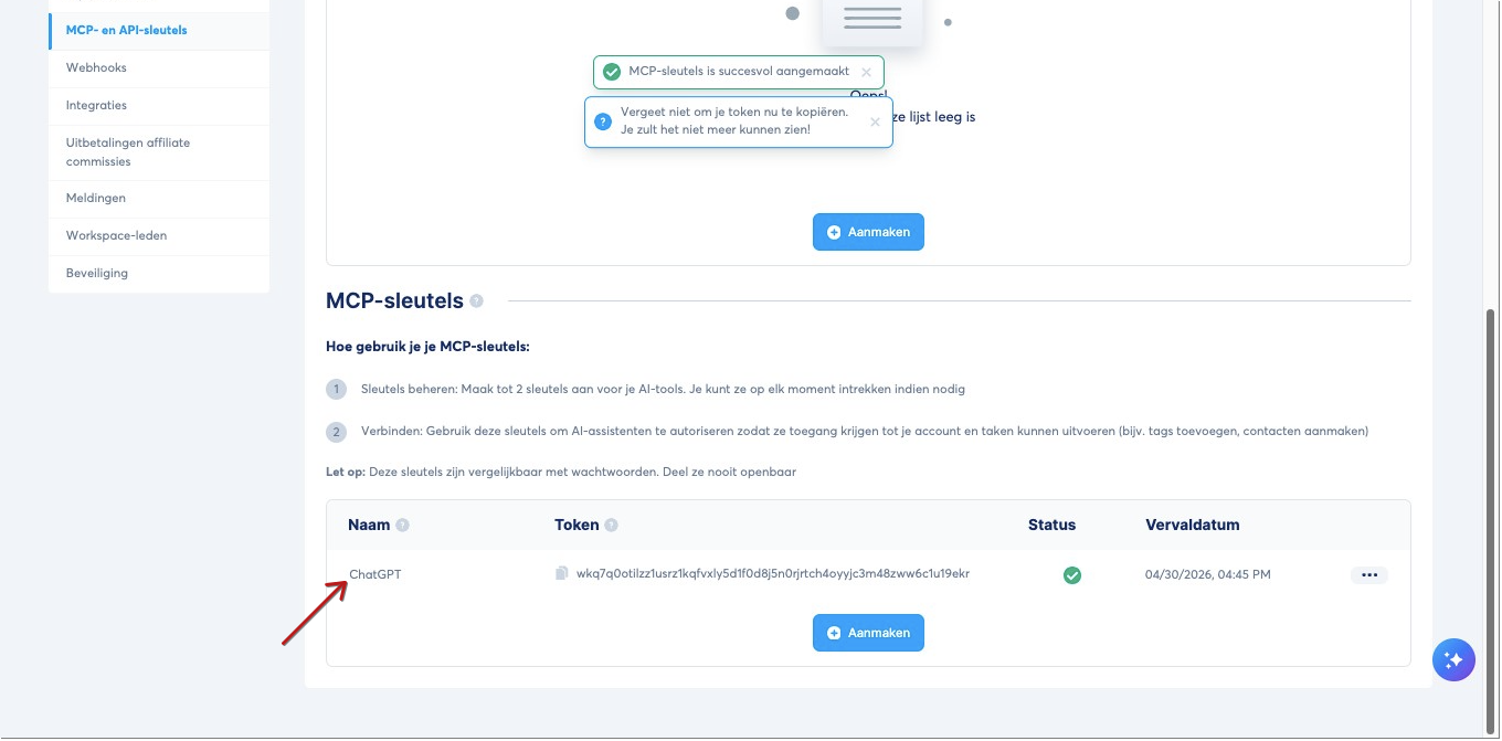 Om een AI‑tool te verbinden, moet je eerst een beveiligde MCP‑sleutel genereren.