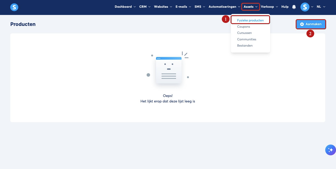 Om een ebook met een btw‑tarief van 5,5% te kunnen verkopen, ga je naar Fysieke producten (1) onder het gedeelte Assets. Klik vervolgens op Aanmaken (2).