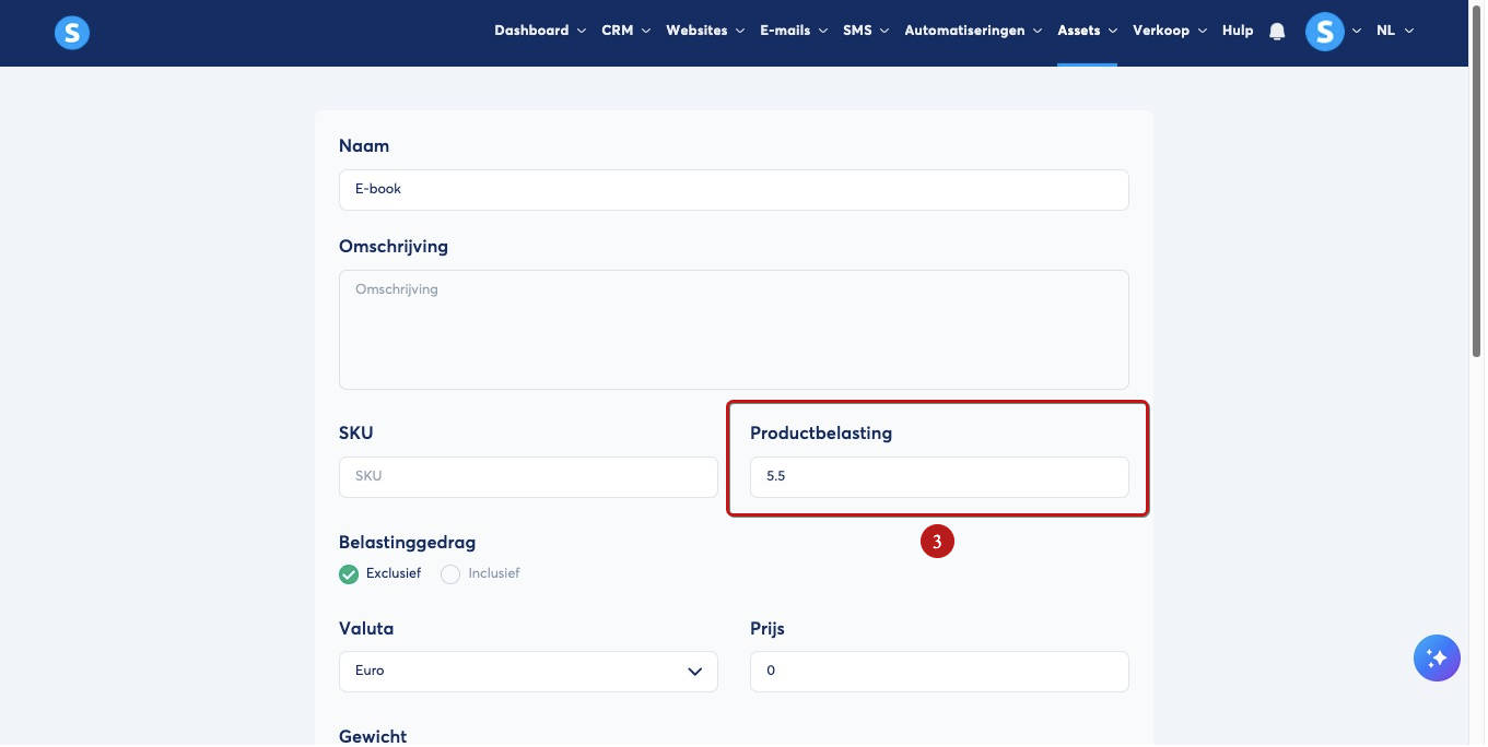 Bij het aanmaken van je fysieke product moet je vóór het opslaan het btw‑tarief instellen op 5,5% (3).