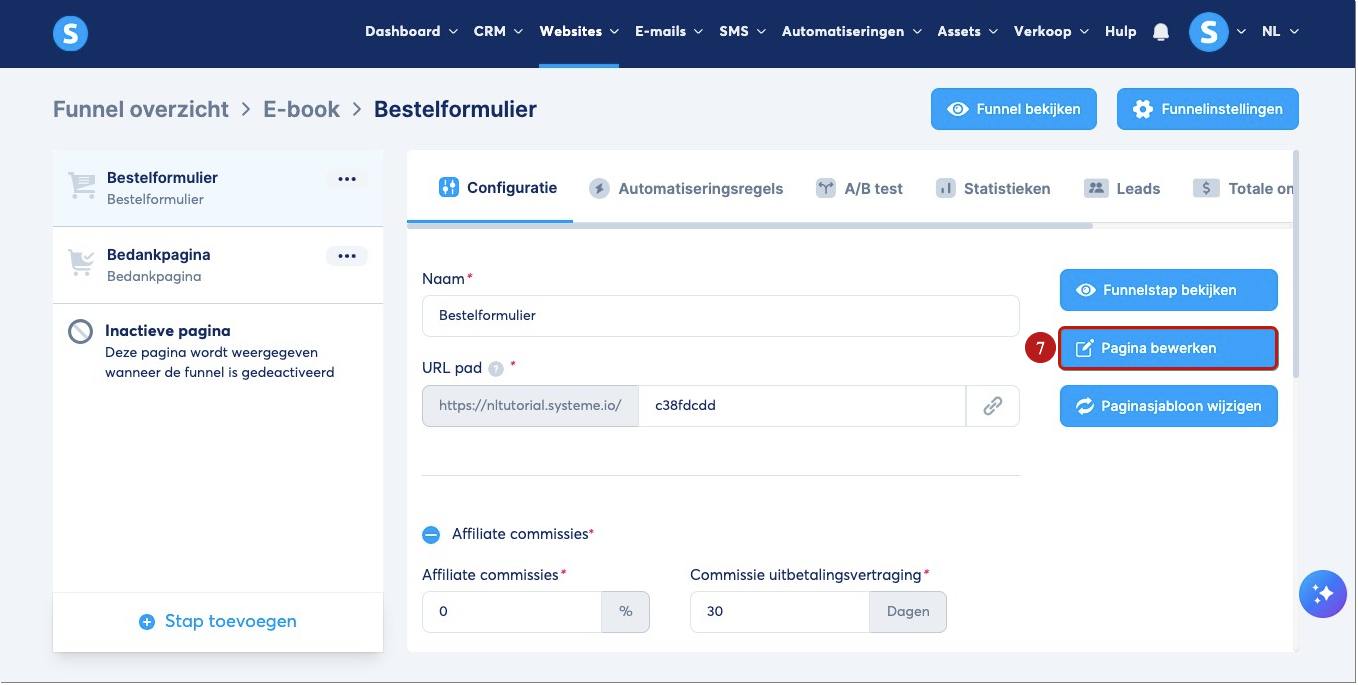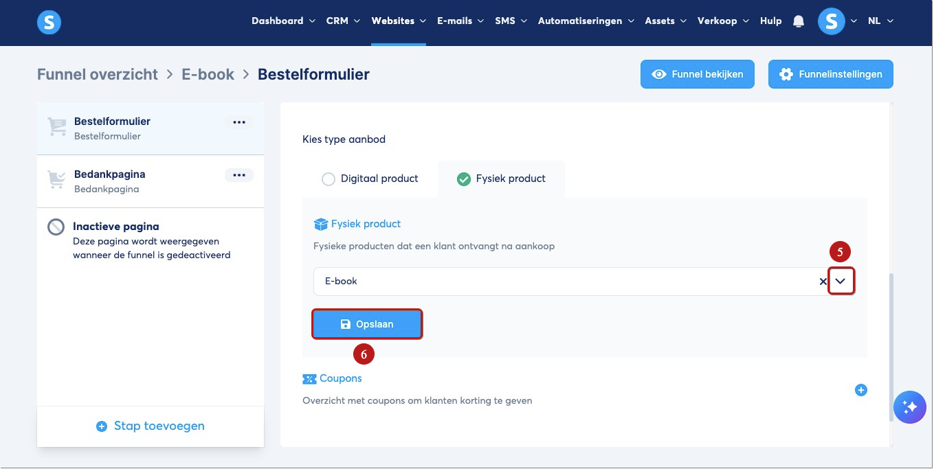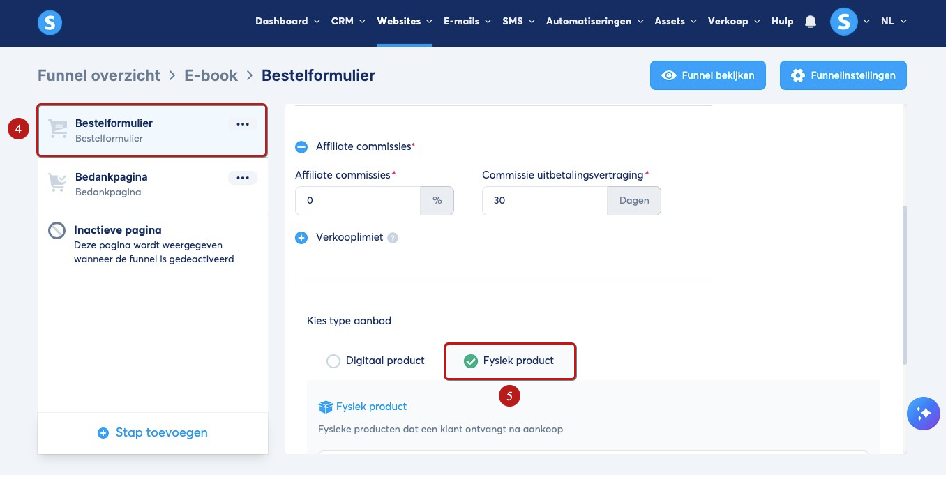 Wanneer je funnel en betaalpagina klaar zijn, klik je op je Bestelformulier‑pagina (4), waar je het product toevoegt dat je hebt aangemaakt.