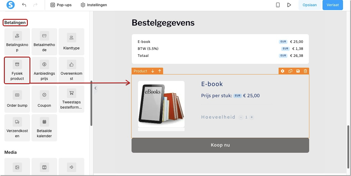 Kies de plek waar je het product wilt tonen. Sleep vervolgens het element Fysiek product uit de sectie Betalingen in de linkerzijbalk naar de gewenste locatie.