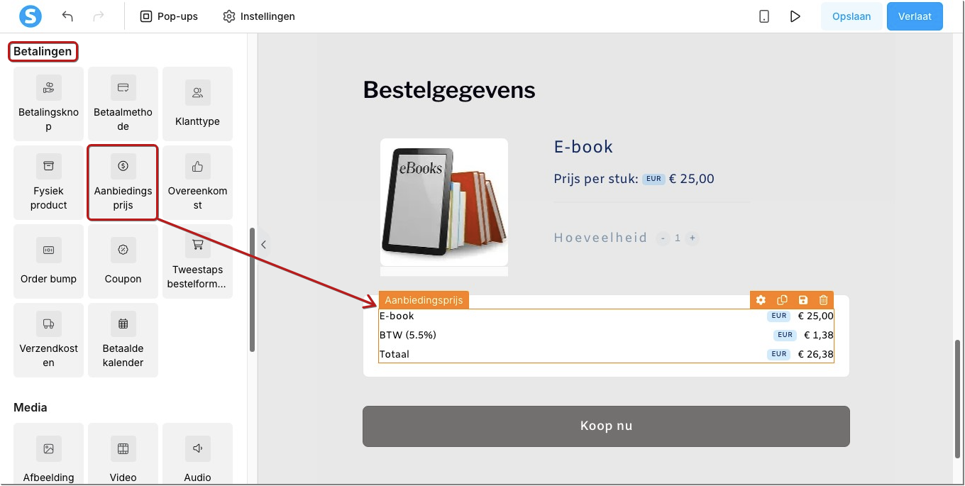 Nu voegen we de prijs toe. Sleep opnieuw een element, dit keer Aanbiedingsprijs, ook te vinden onder Betalingen.