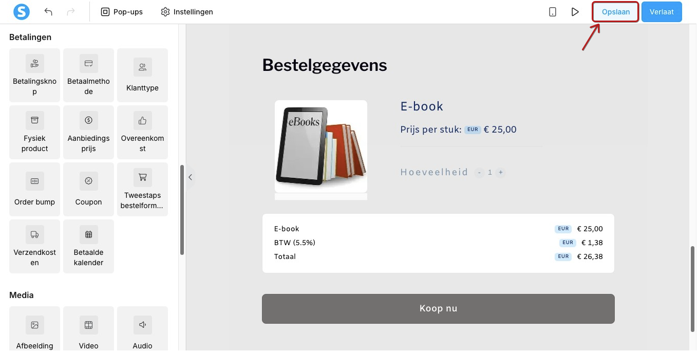 In de editor kun je de elementen naar wens ordenen, maar het belangrijkste is dat we je product aan de betaalpagina gaan toevoegen.