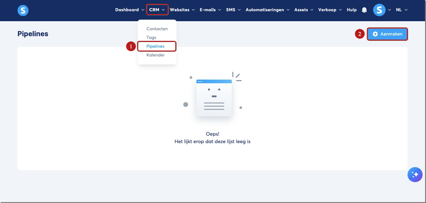 Om een pipeline aan te maken in systeme.io, ga je in het menu van je account naar het onderdeel CRM en klik je op Pipelines (1). Klik vervolgens op Aanmaken (2).