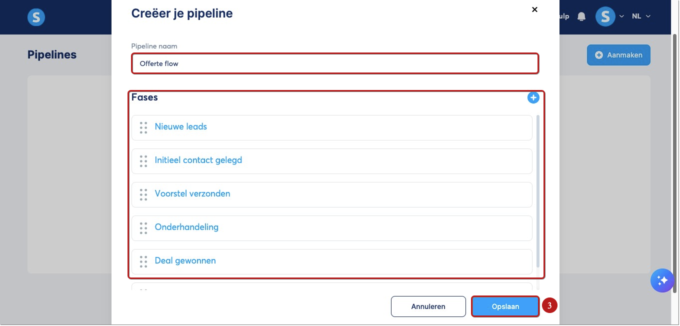 Het is belangrijk om te weten dat een nieuwe sales‑pipeline standaard wordt aangemaakt met zes stappen. Je kunt deze stappen eenvoudig aanpassen aan jouw behoeften. De standaardstappen zijn: