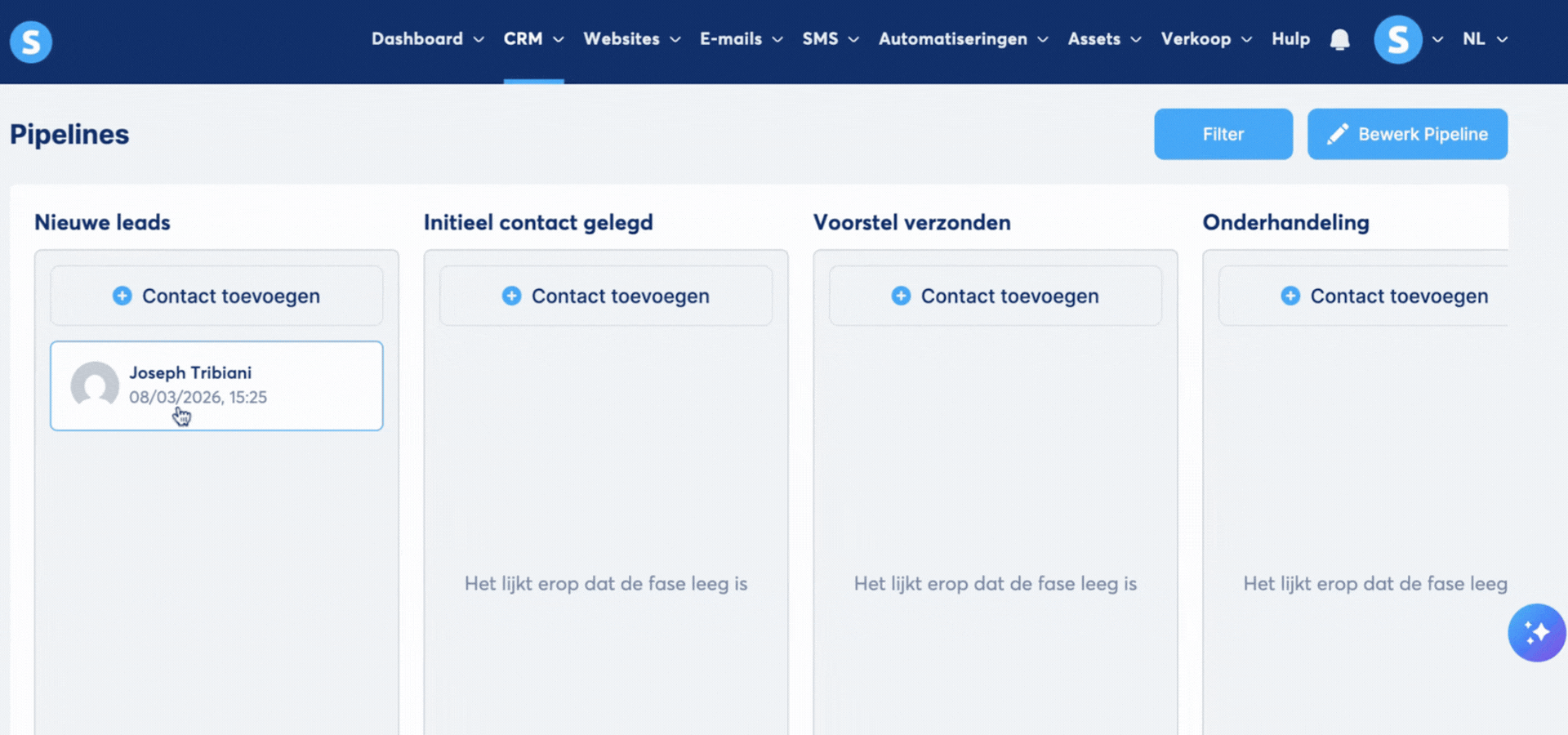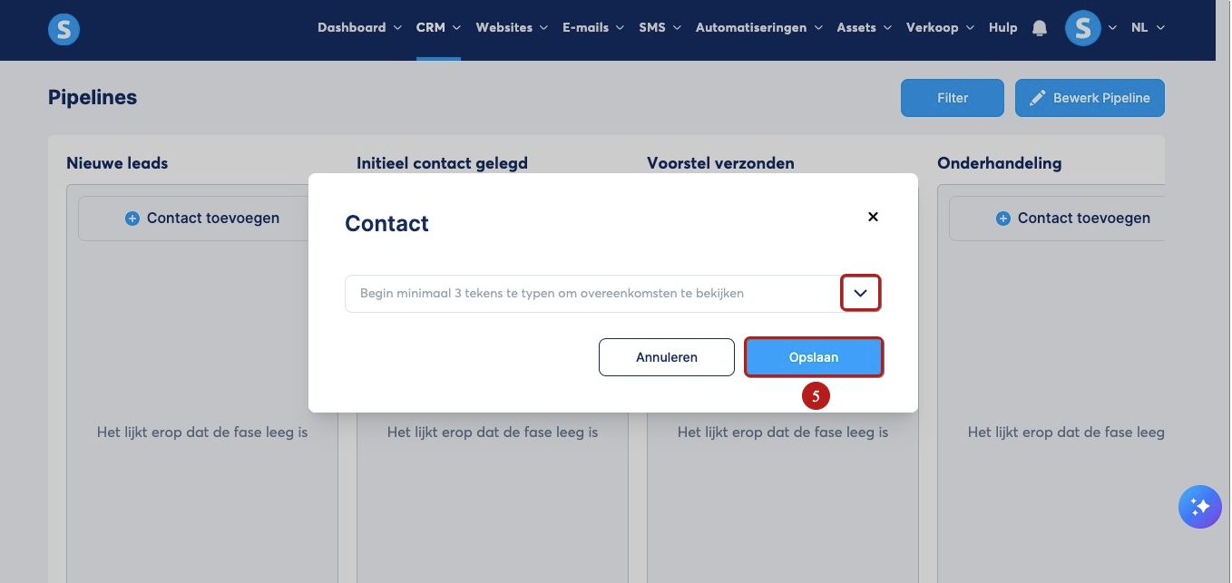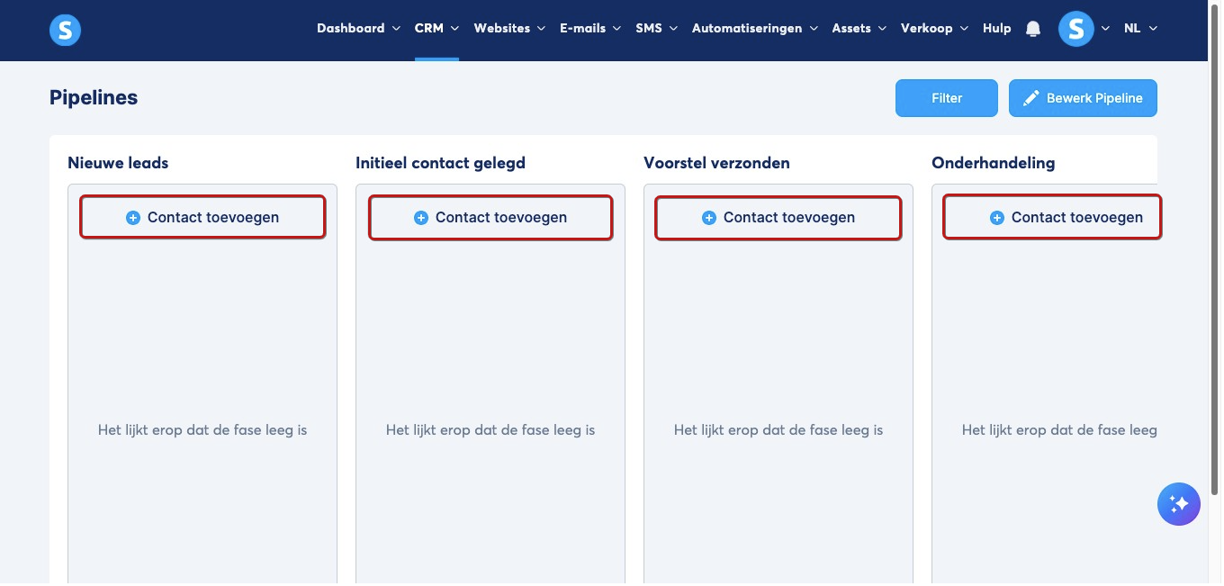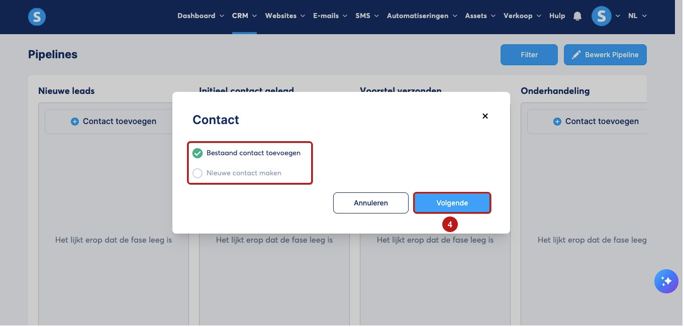 Voeg (bestaande of nieuwe) contacten toe aan elke gewenste stap in de pipeline door naar die stap te gaan en te klikken op Contact toevoegen.