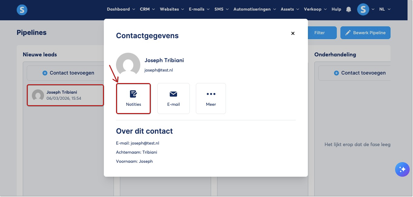 Je kunt ook notities toevoegen aan het profiel van je pipeline‑contacten. Dit helpt je om belangrijke informatie per contact vast te leggen, zoals essentiële details, ideeën of samenvattingen van telefoongesprekken. Zo wordt alle informatie op één plek gecentraliseerd voor optimale organisatie.