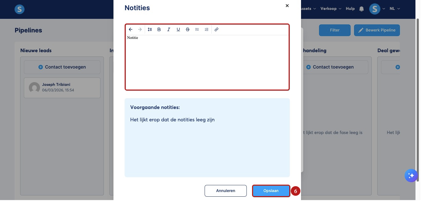 Daarna hoef je alleen nog een notitie te schrijven en deze op te slaan door op Opslaan (6) te klikken. Je kunt ook de eerdere notities bekijken die aan dit contact zijn toegevoegd.
