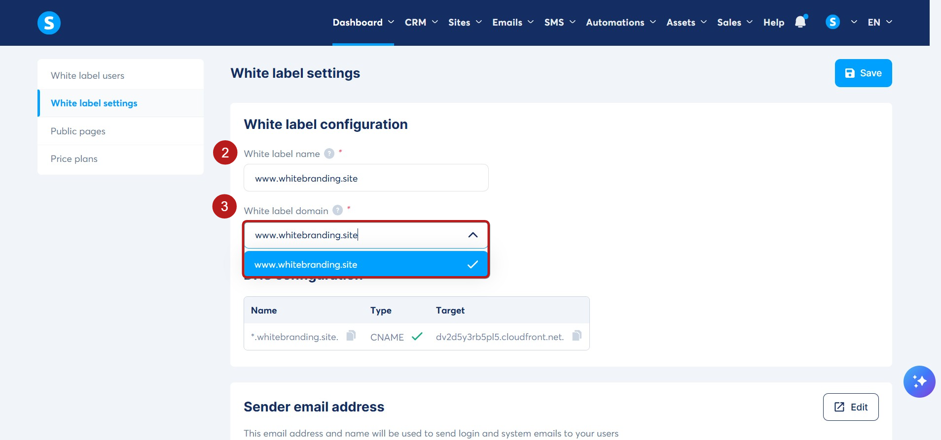 Voer je White label naam (2) in. Deze naam wordt gebruikt als de bedrijfsnaam in transactionele e-mails. Je kunt er ook voor kiezen je White label custom domain (3) te wijzigen.