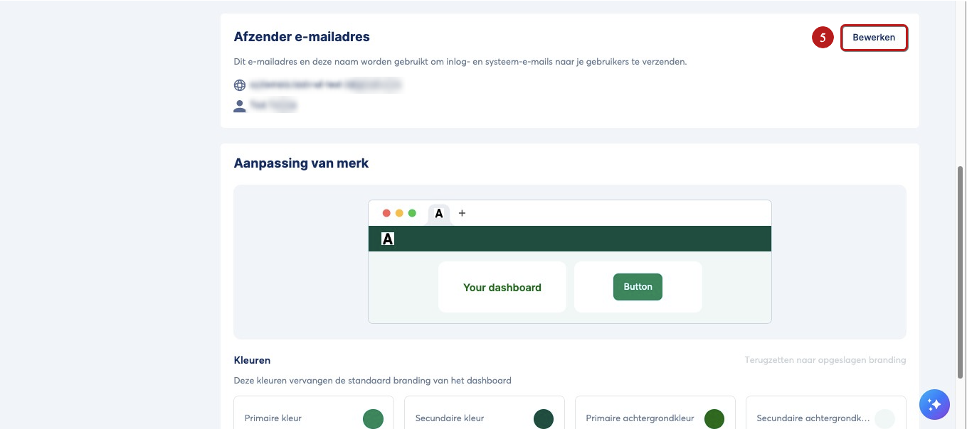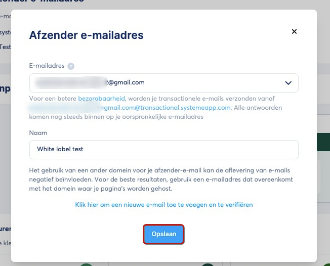 Belangrijk: het afzender‑e-mailadres en de afzendernaam die je hier instelt, worden toegepast op alle e‑mails die vanuit je white‑labeldomein naar je white‑labelgebruikers worden verzonden.