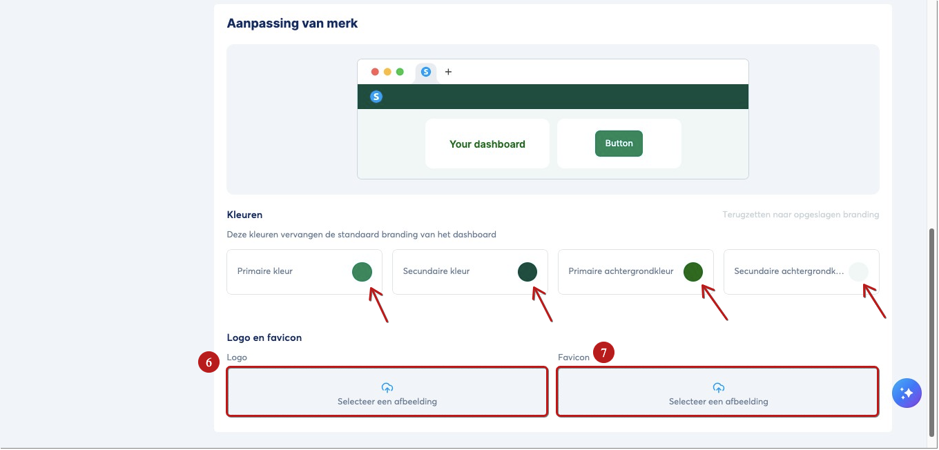 - Klik op Selecteer een afbeelding om je logo (6) en favicon (7) te uploaden.