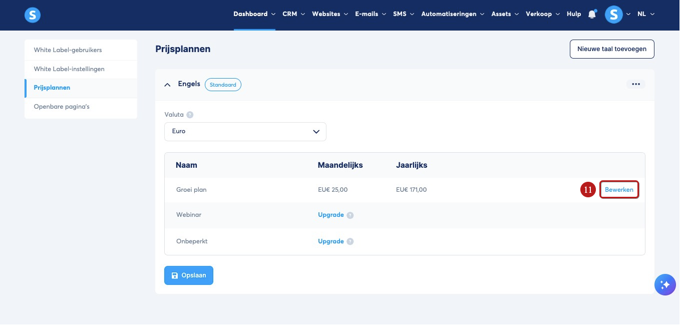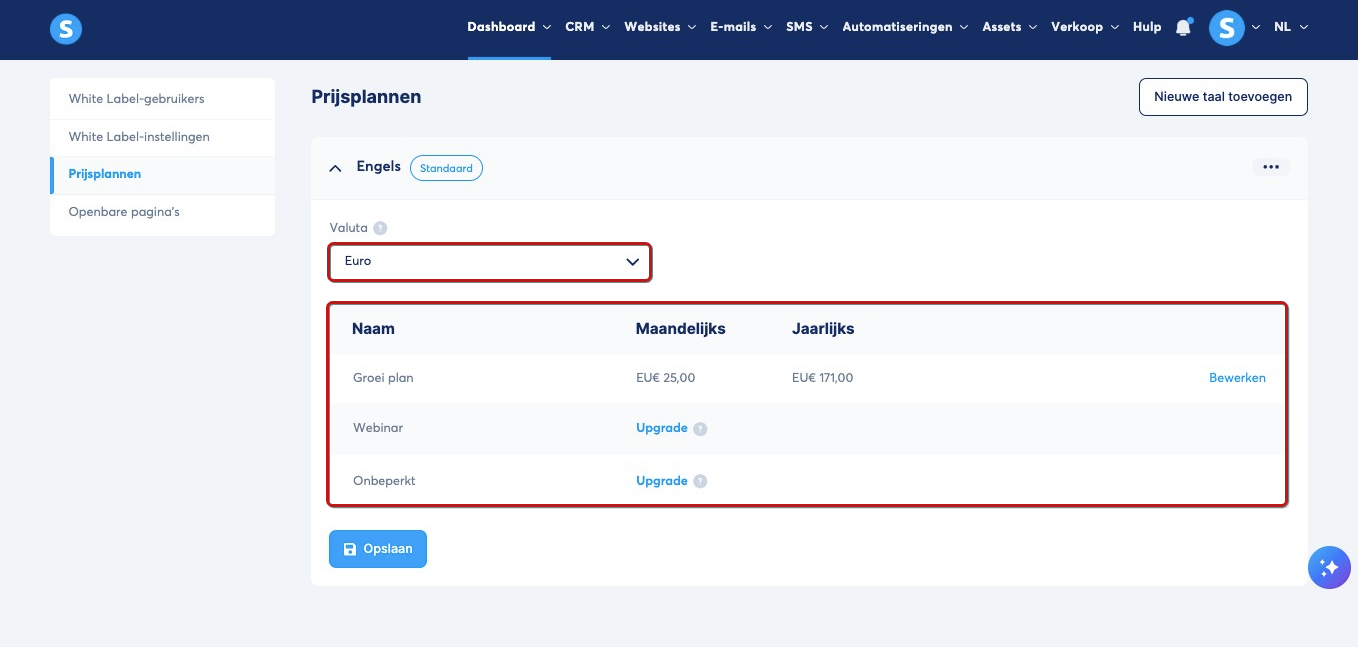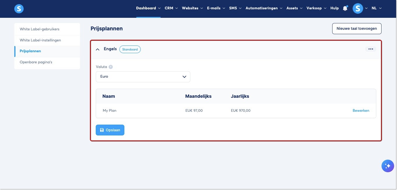 Wanneer je de white‑labelfunctie activeert, wordt er automatisch een standaard Engels prijsplan voor je aangemaakt.
