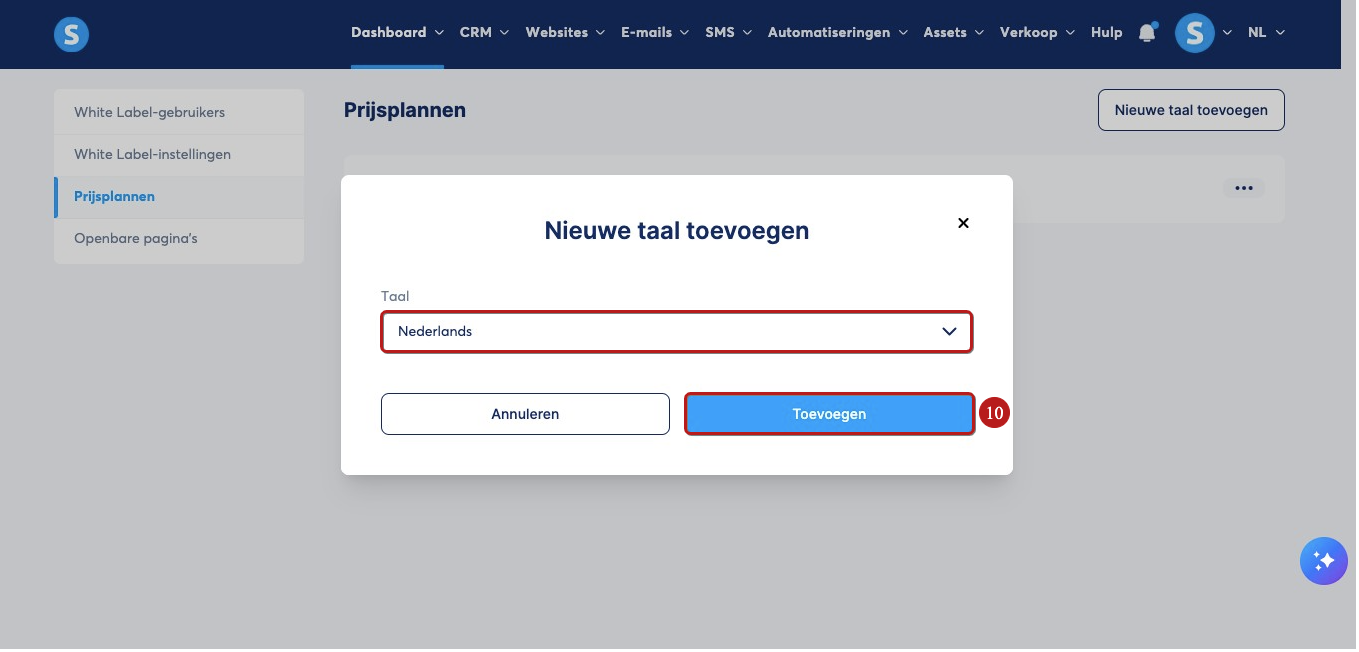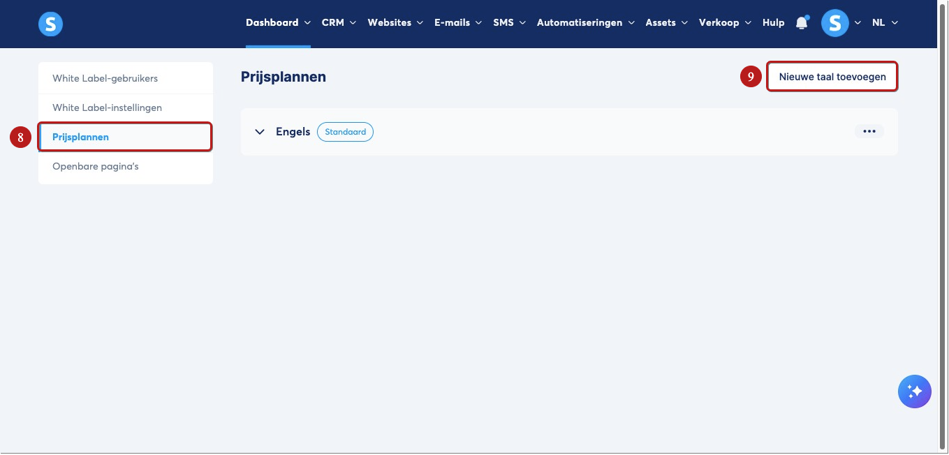 Om prijsplannen voor extra talen aan te maken, ga je in je agency‑dashboard naar Prijsplannen (8) en klik je op Nieuwe taal toevoegen (9).