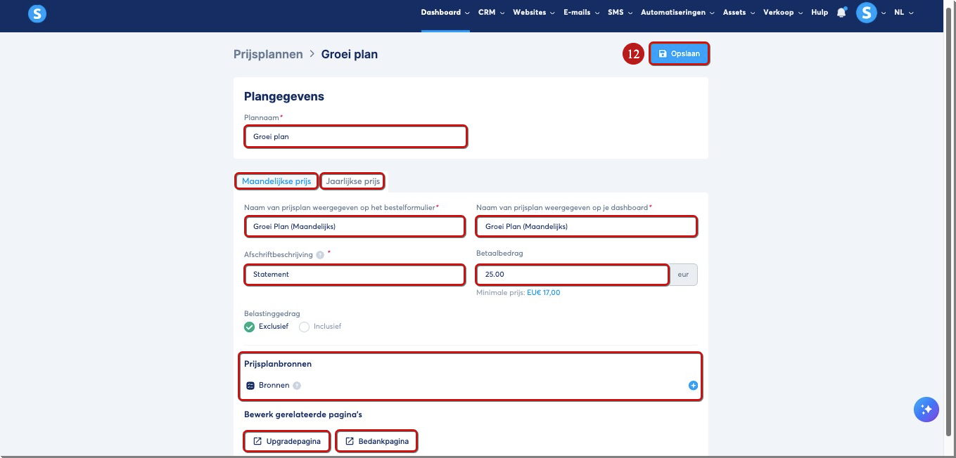 Belangrijk: De prijs van elk plan dat je aanmaakt, mag niet lager zijn dan de systeme.io‑prijs in die valuta.