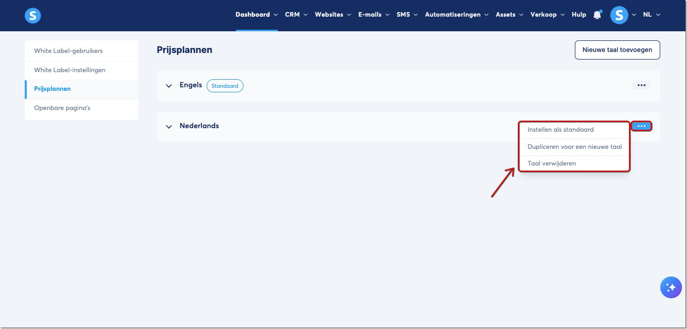 Na het opslaan van een taal verschijnt deze in je lijst met prijsplannen. Klik op het driepuntjesmenu naast een taal om de volgende opties te openen: