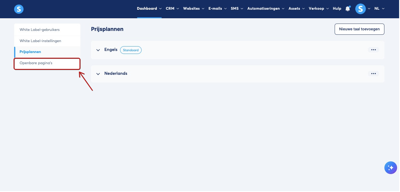 Je kunt je publieke pagina’s openen en bewerken via het tabblad Openbare pagina's in je white‑labeldashboard.