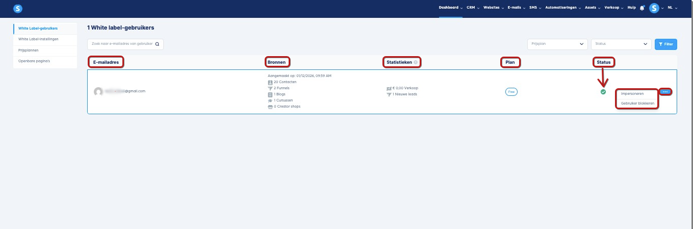 Zodra white‑labelaccounts zijn aangemaakt, kun je ze bekijken en beheren via het White label gebruikers‑dashboard.