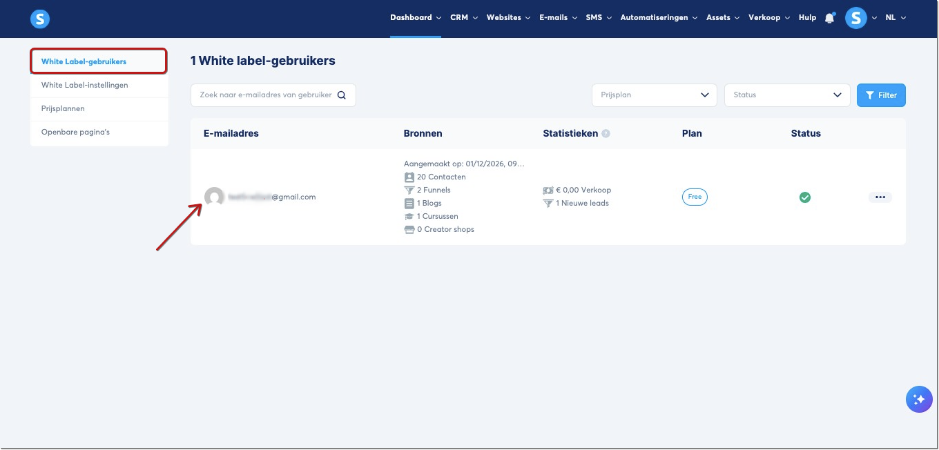 En de White label-gebruiker verschijnt automatisch op het tabblad White label-gebruikers van je agency dashboard.