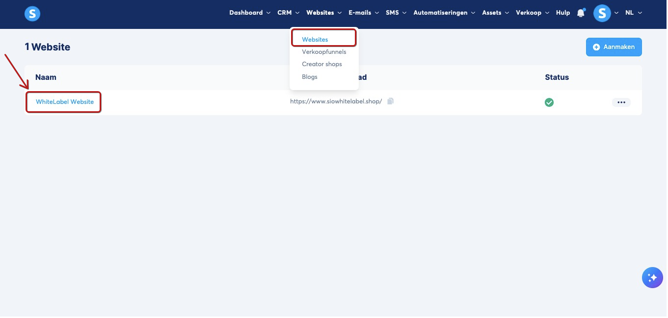 Je kunt je website ook openen via Websites onder het tabblad Website’s. Daar verschijnt hij als “WhiteLabel Website”.