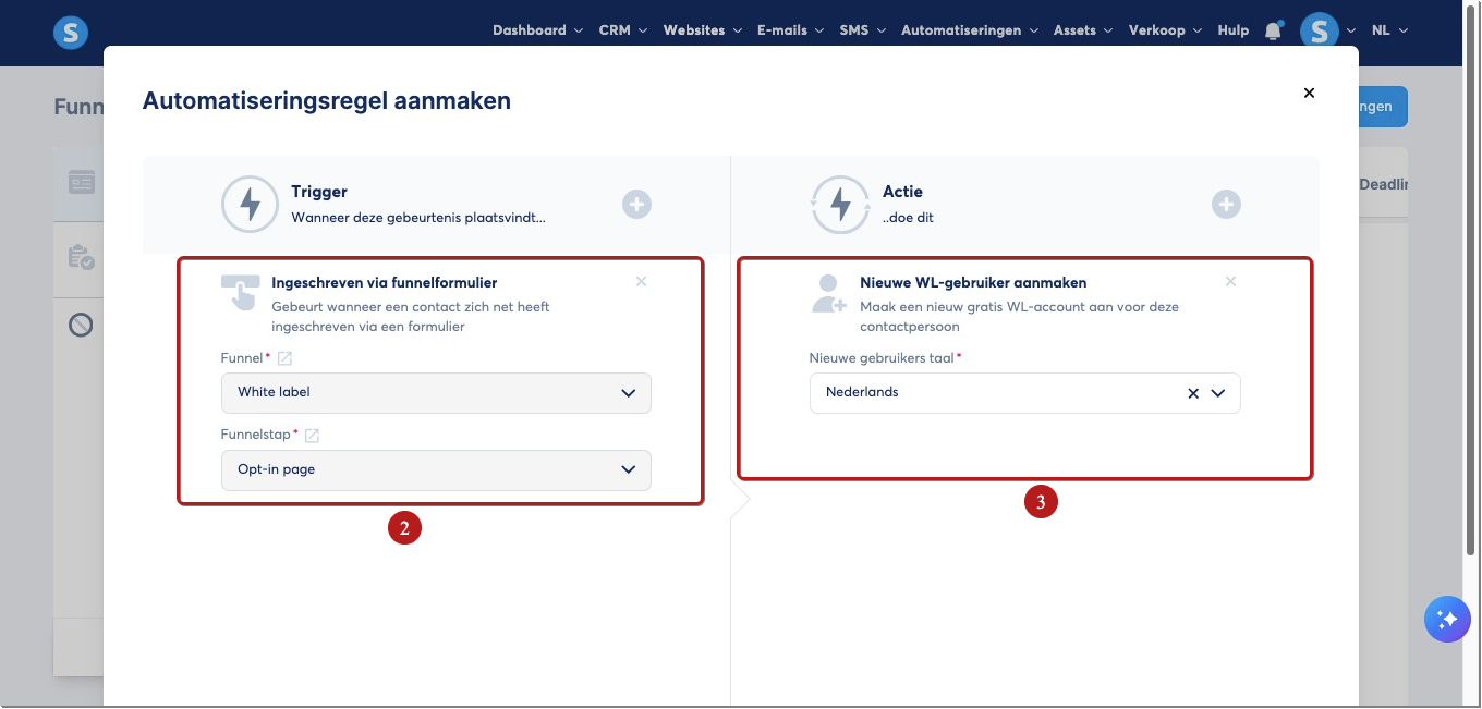 Selecteer Ingeschreven via funnellformulier als trigger (2). Kies vervolgens Nieuwe WL-gebruiker aanmaken als actie, selecteer de taal van de gebruiker (3), en sla de regel op.
