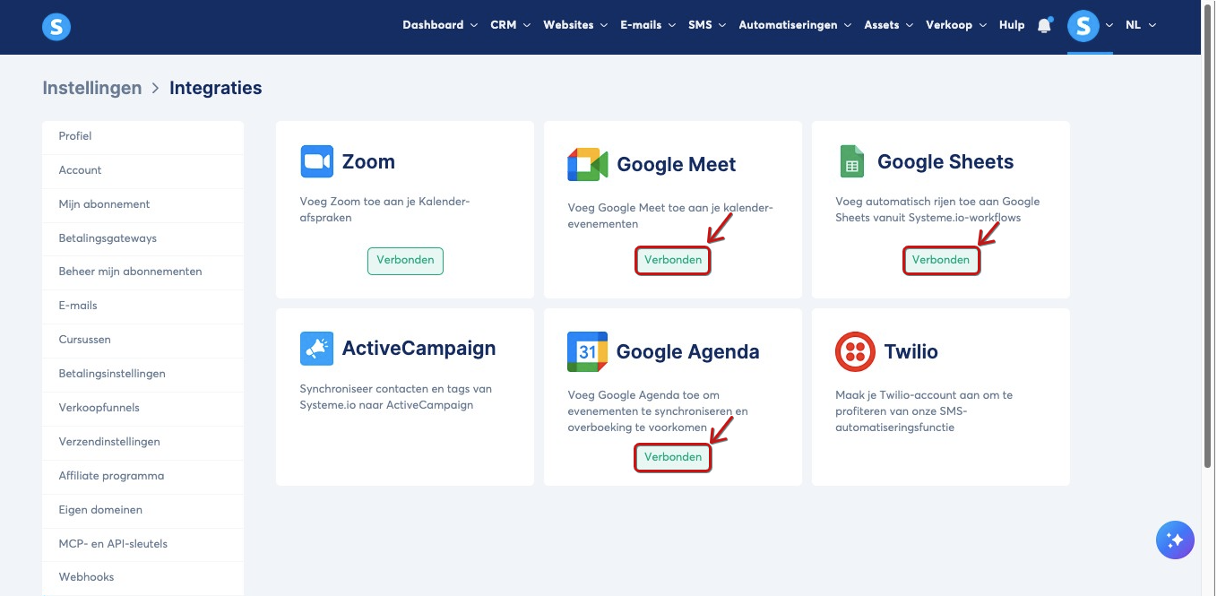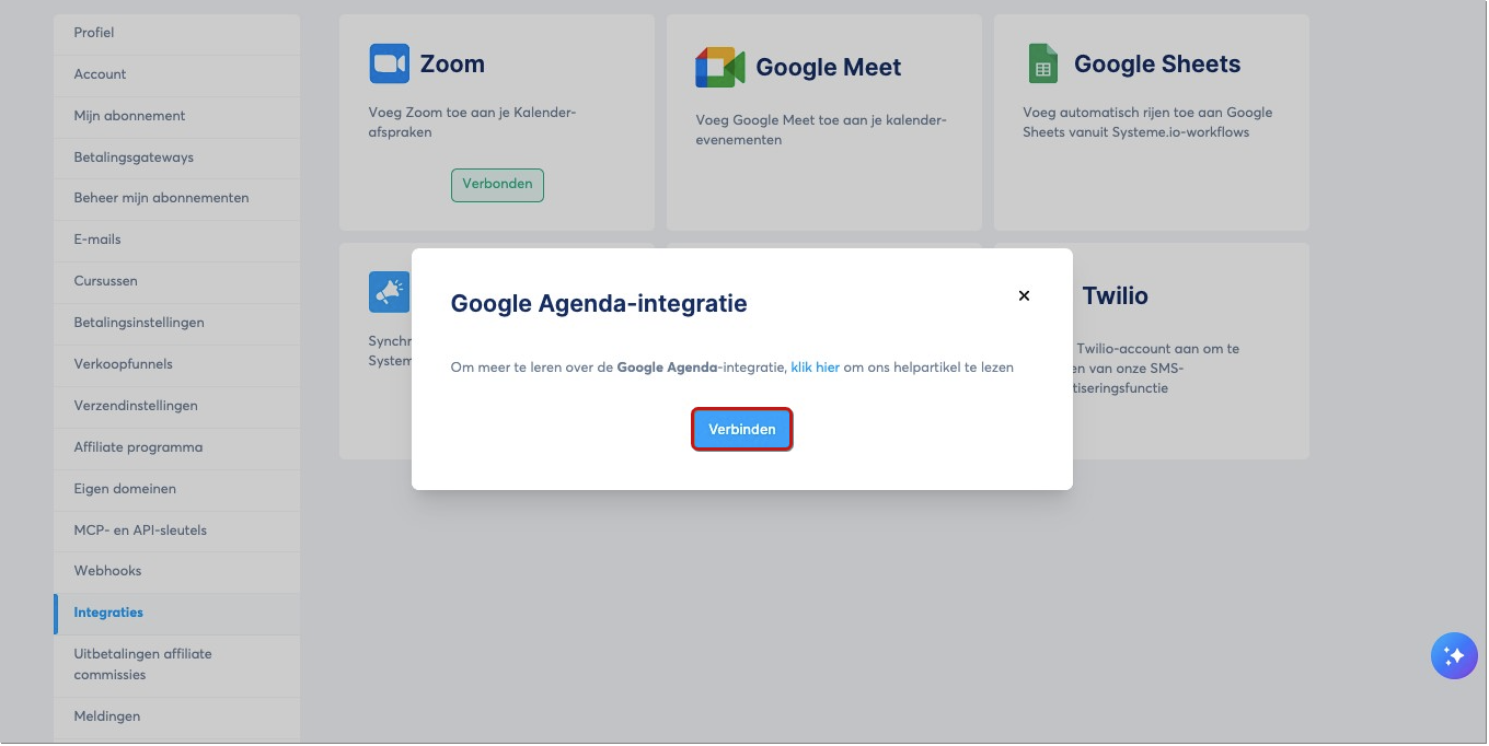 Opmerking: Google Meet en Google Sheets zullen standaard worden verbonden met je systeme.io-account na de integratie van Google Agenda.