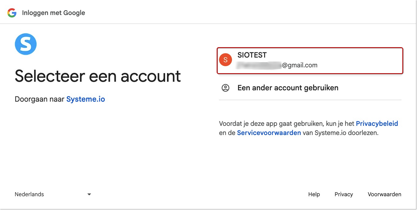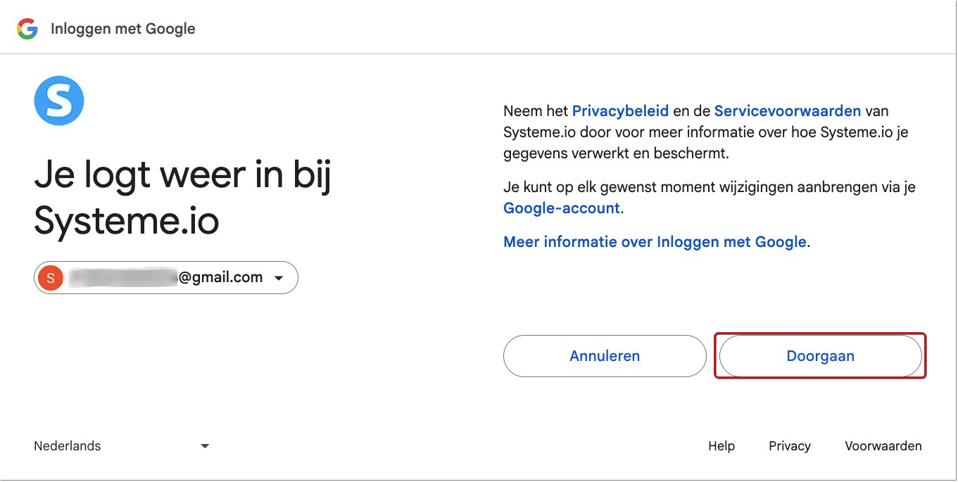 6. Klik op Doorgaan zodat Google systeme.io toegang geeft tot je informatie.