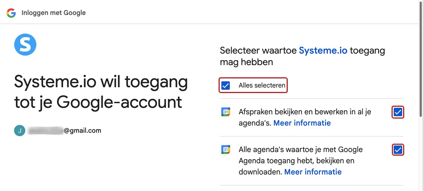 7. Er opent een venster met een toestemmingsverzoek van Systeme.io om toegang te krijgen tot je Google Agenda. Vink eenvoudig het vakje Alles Selecteren aan tijdens de toestemmingsaanvraag, waarmee toegang wordt geactiveerd om al je agenda's te bekijken, te wijzigen en te beheren. Dit stelt Systeme.io in staat om automatisch je evenementen te synchroniseren, vooral voor het plannen van afspraken of kalendergerelateerde automatiseringen.