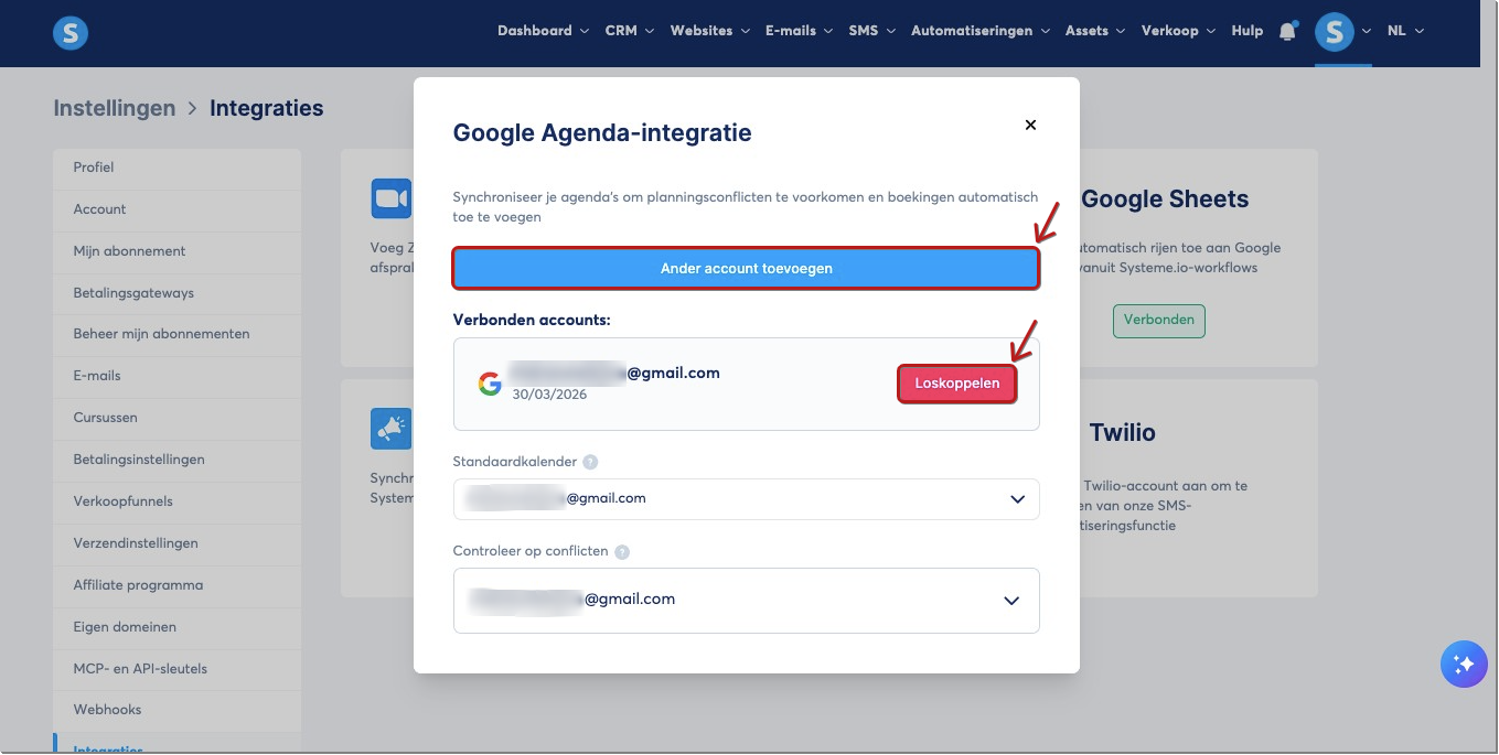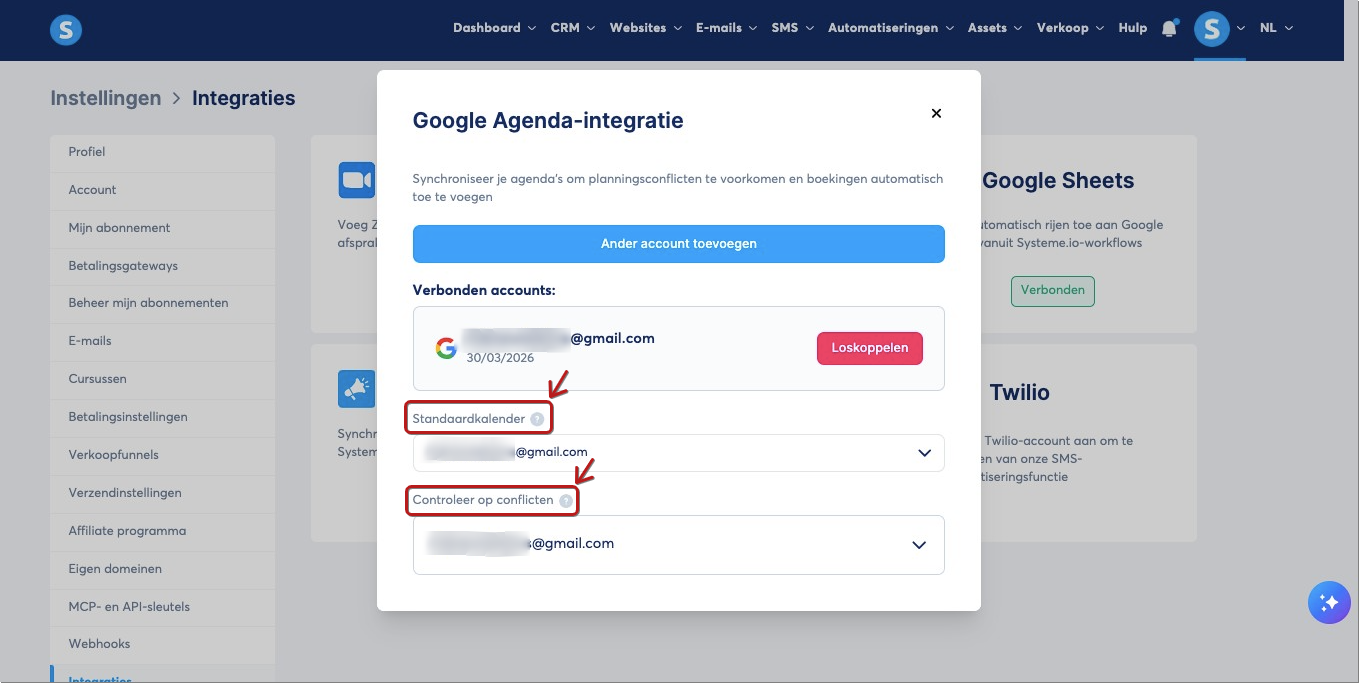 - Je kunt meerdere Google Agenda-accounts integreren in je systeme.io-account.
