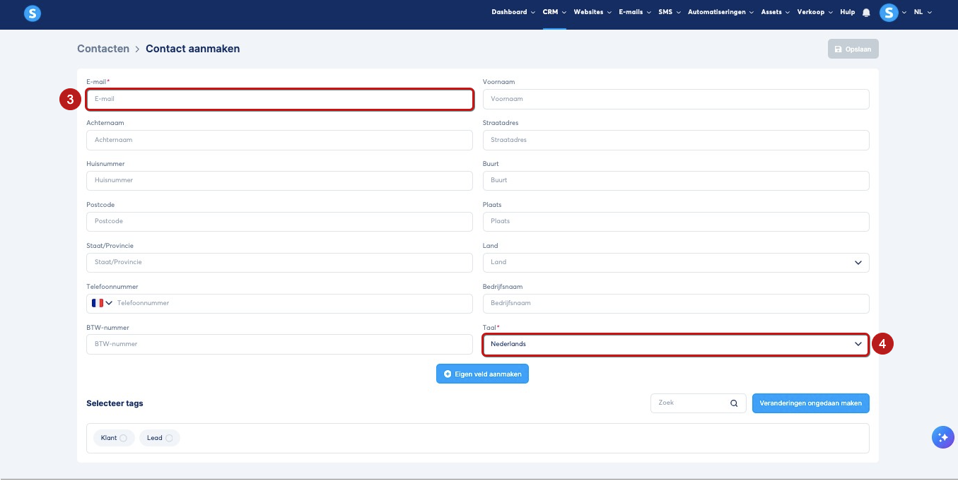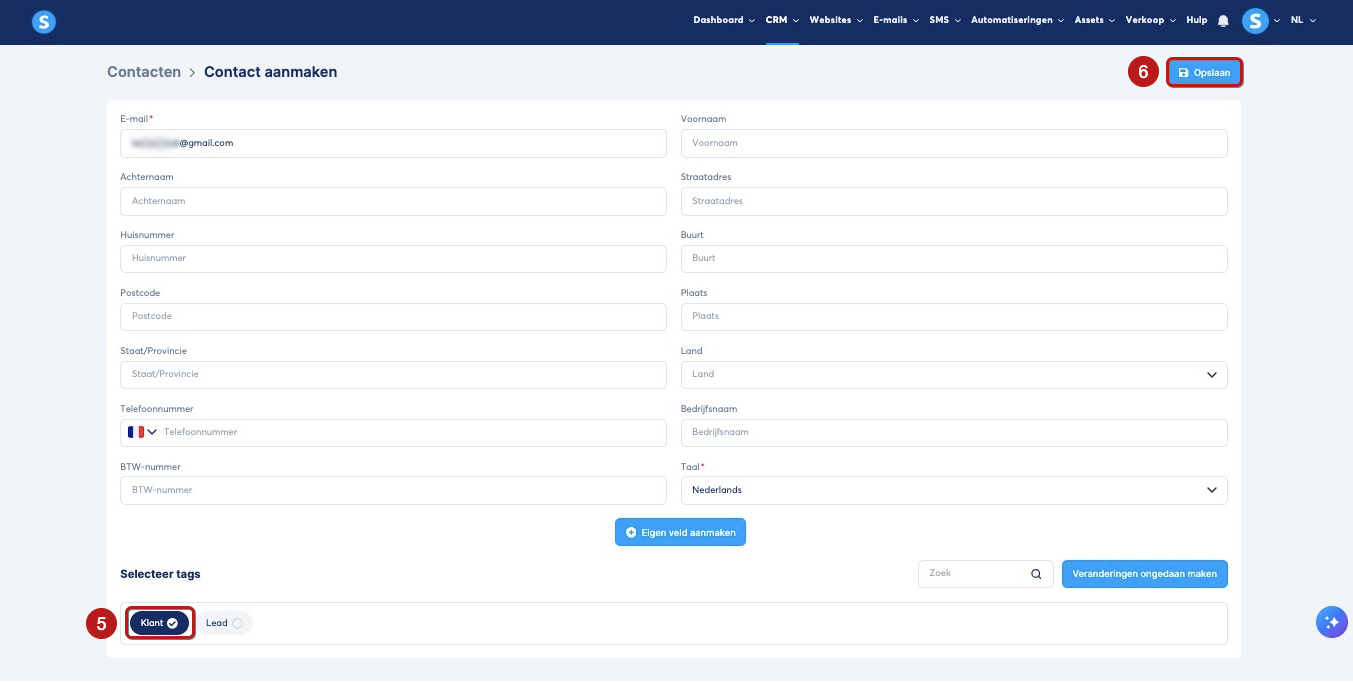 Je kunt een tag koppelen wanneer je het contact toevoegt door de gewenste tag aan te vinken (nummer 5 op de afbeelding), en vervolgens op "Opslaan" te klikken (nummer 6 op de afbeelding).
