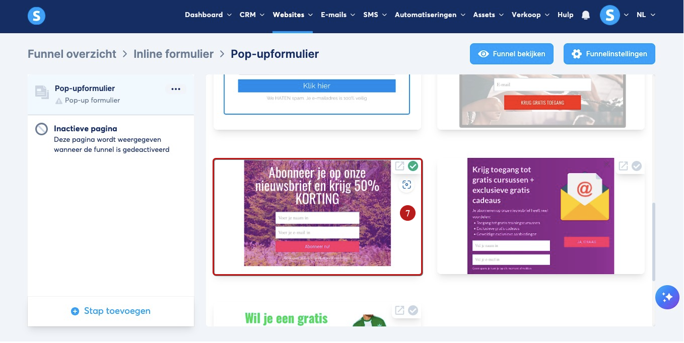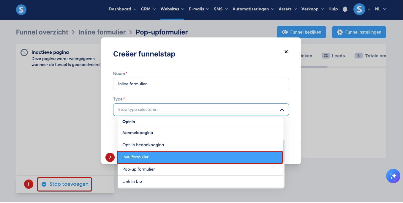 Ga naar je Verkoopfunnel, klik op Stap toevoegen (5) om een nieuwe stap te maken en kies vervolgens Popup Formulier (6).