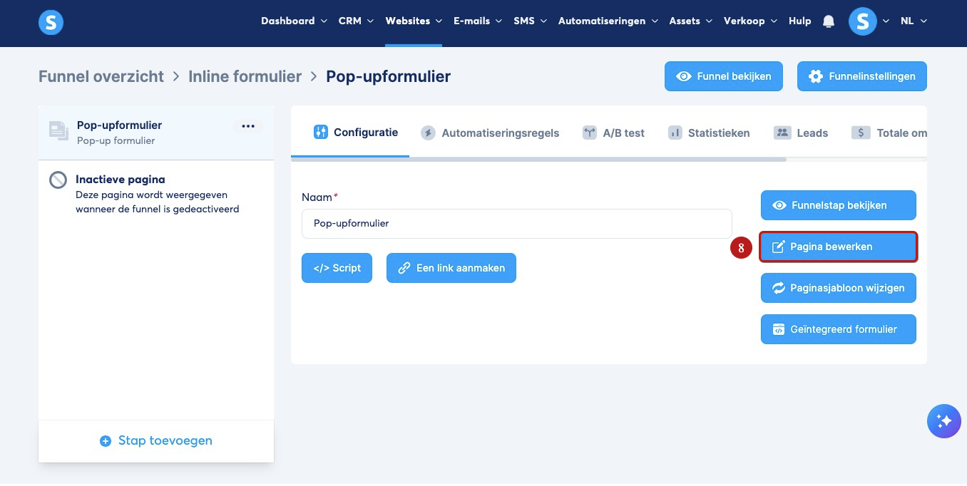 Ga naar de pagina‑editor van het formulier door op Pagina bewerken (8) te klikken om je popupformulier aan te passen.