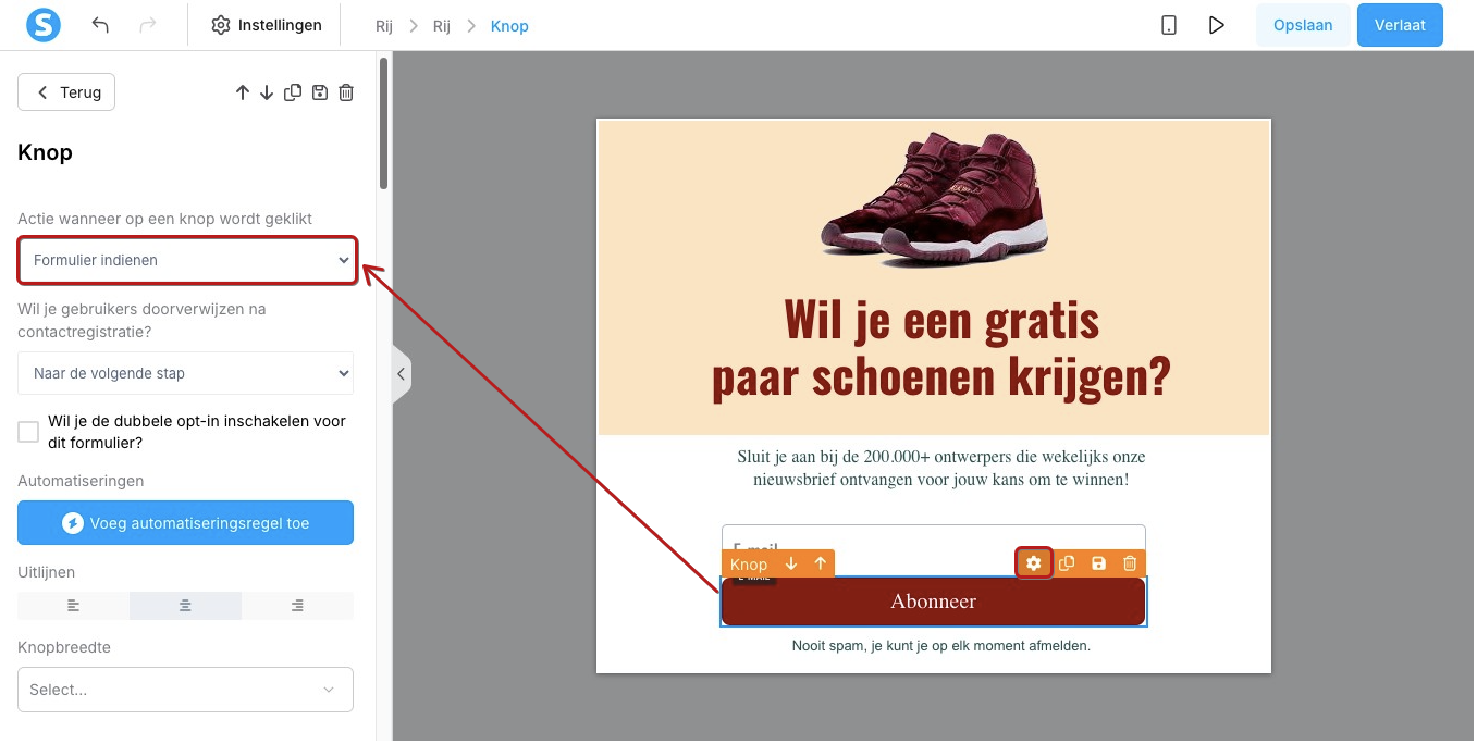 Je moet ook de actie van de knop instellen. Selecteer de knop en kies wat er moet gebeuren nadat de gebruiker het formulier verstuurt.