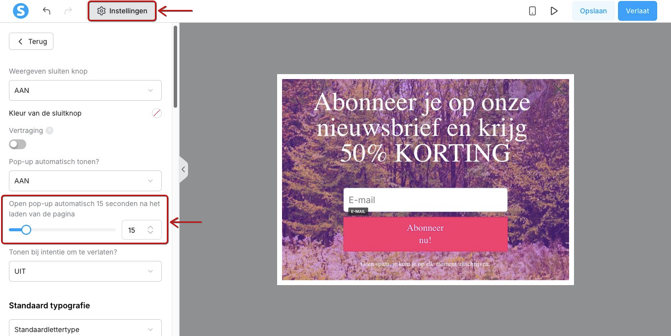 - Automatisch: de popup verschijnt na een ingestelde tijdsvertraging.