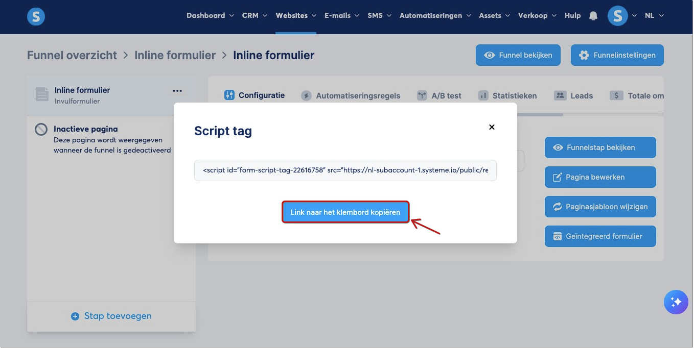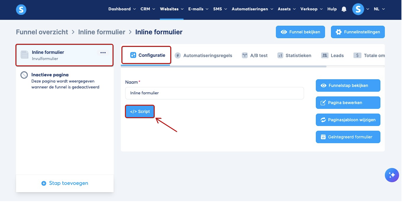 Klik op Wijzig code en plak het script van de link die je hebt opgehaald van de pagina van je inline formulier.