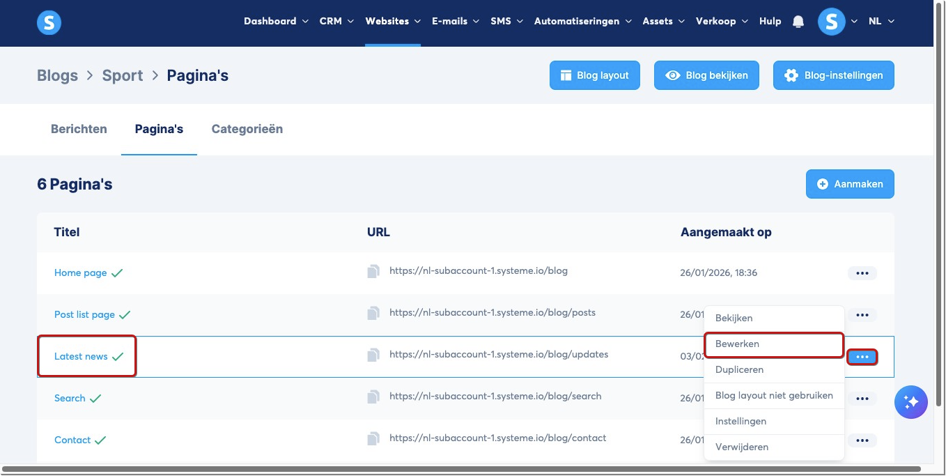 Ga vervolgens naar de editor van de blogpagina door in het menu op Bewerken te klikken, of klik direct op de naam van de pagina waarop je het inline formulier wilt toevoegen.