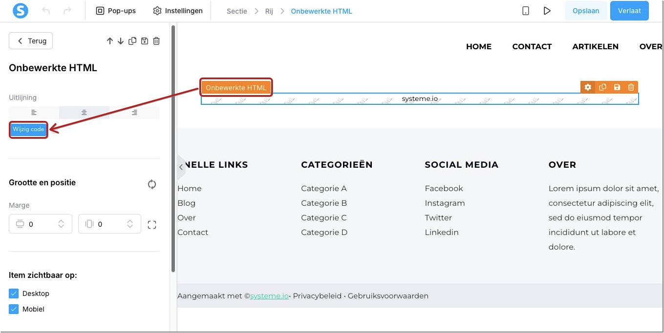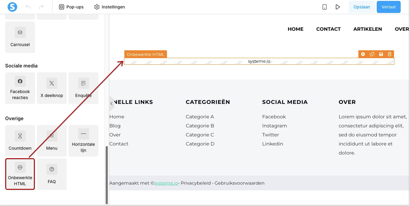 Ga ten slotte naar de instellingen van het Onbewerkte HTML-element.