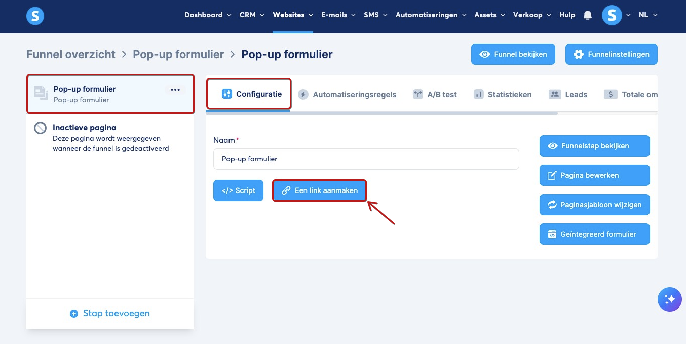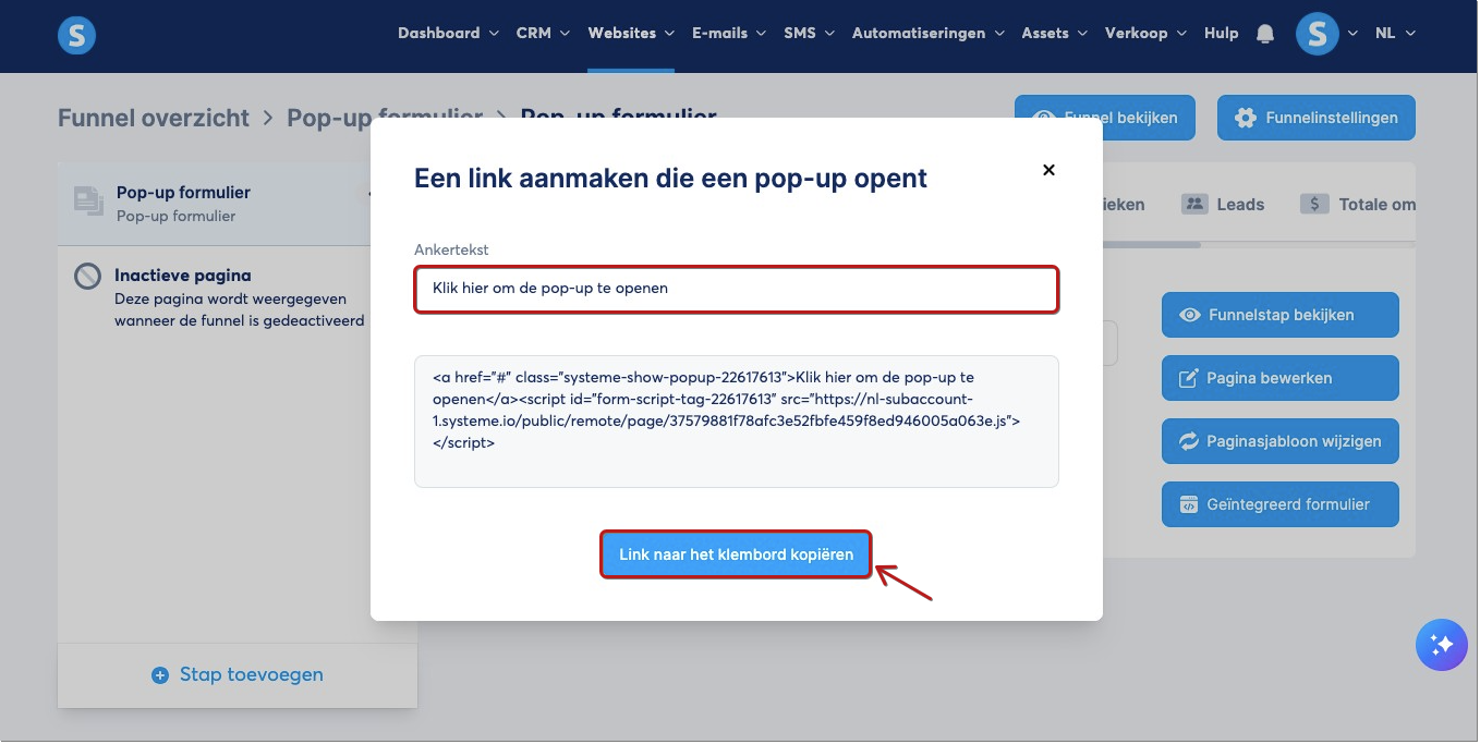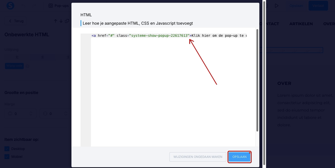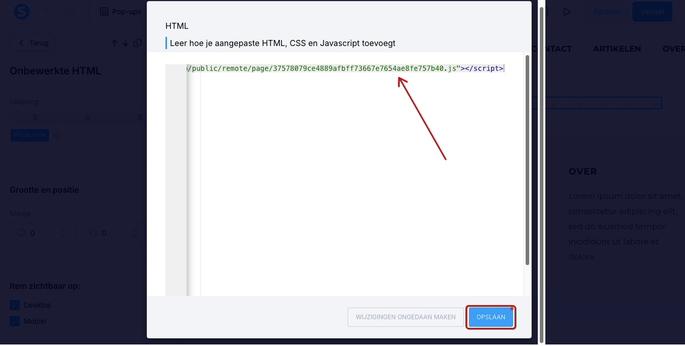 Klik op Wijzig code en plak het script van de link die de popupformulier‑pagina opent. Klik daarna op Opslaan.