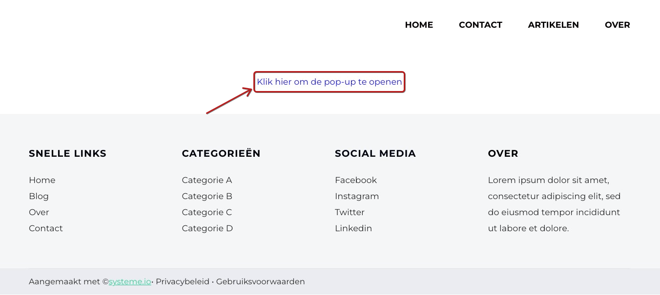 - Bij klik: de popup verschijnt wanneer een gebruiker op een specifieke link of tekst klikt.