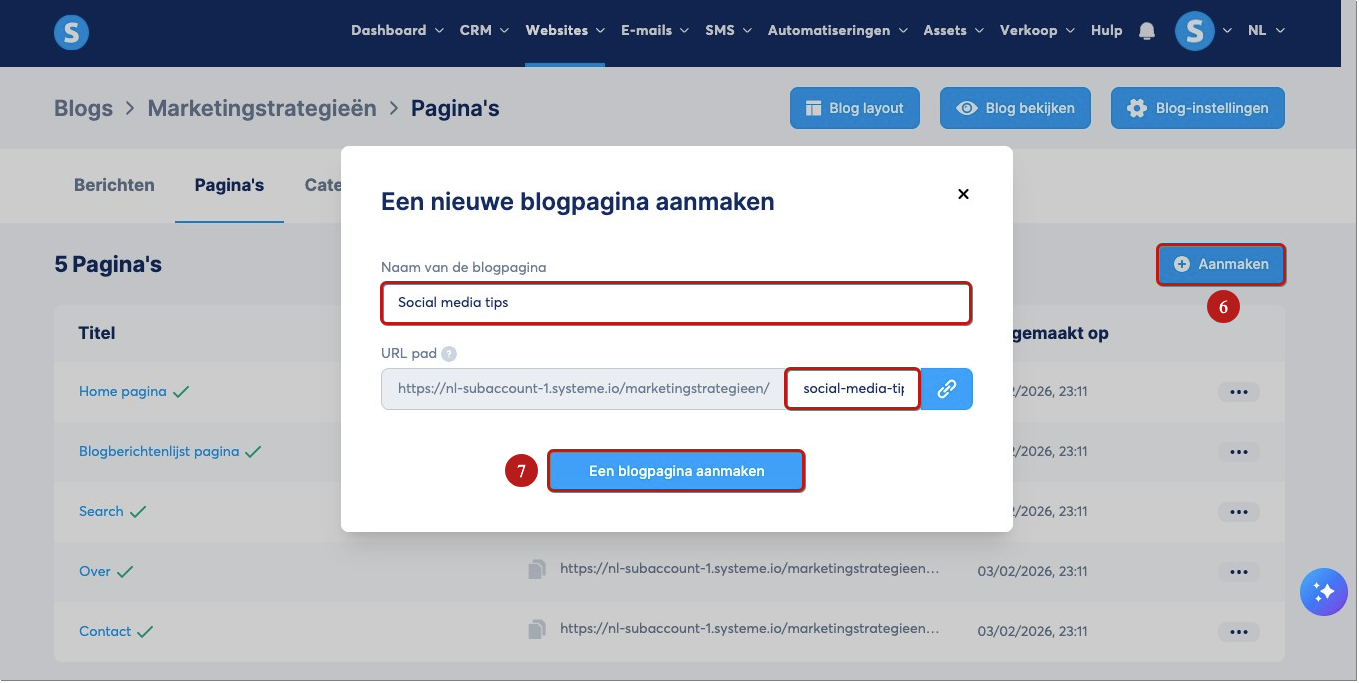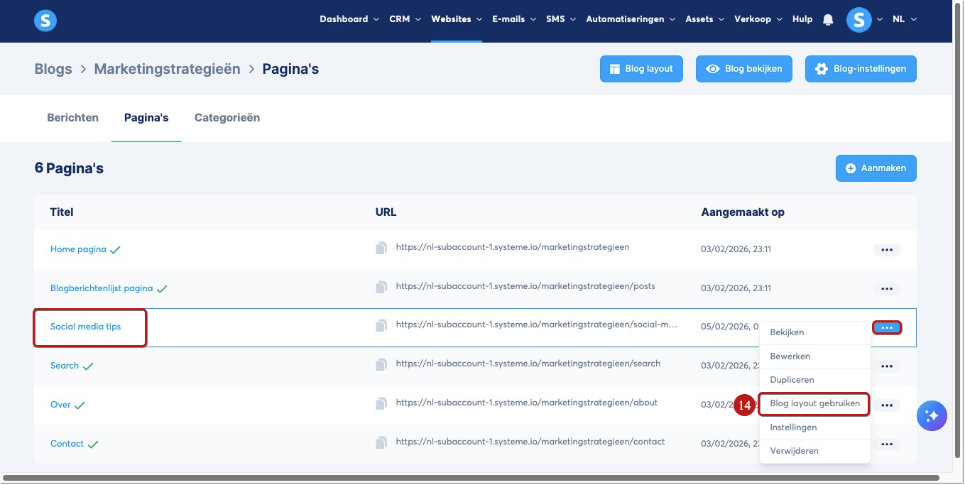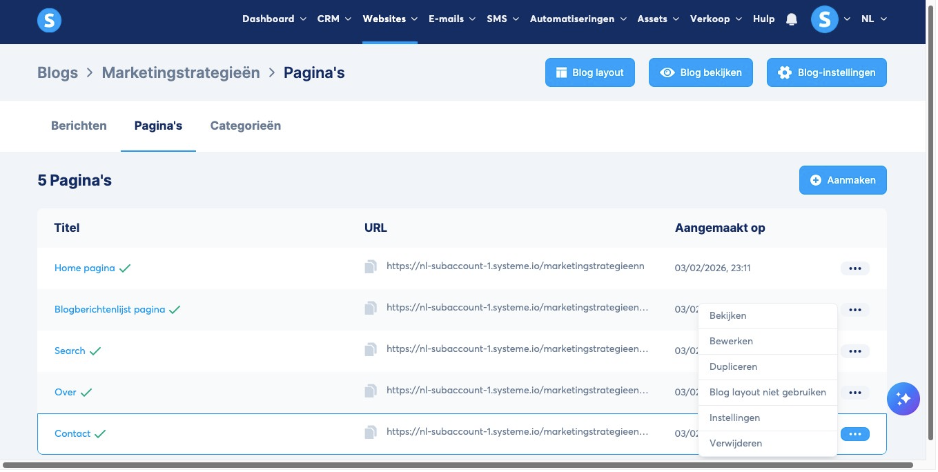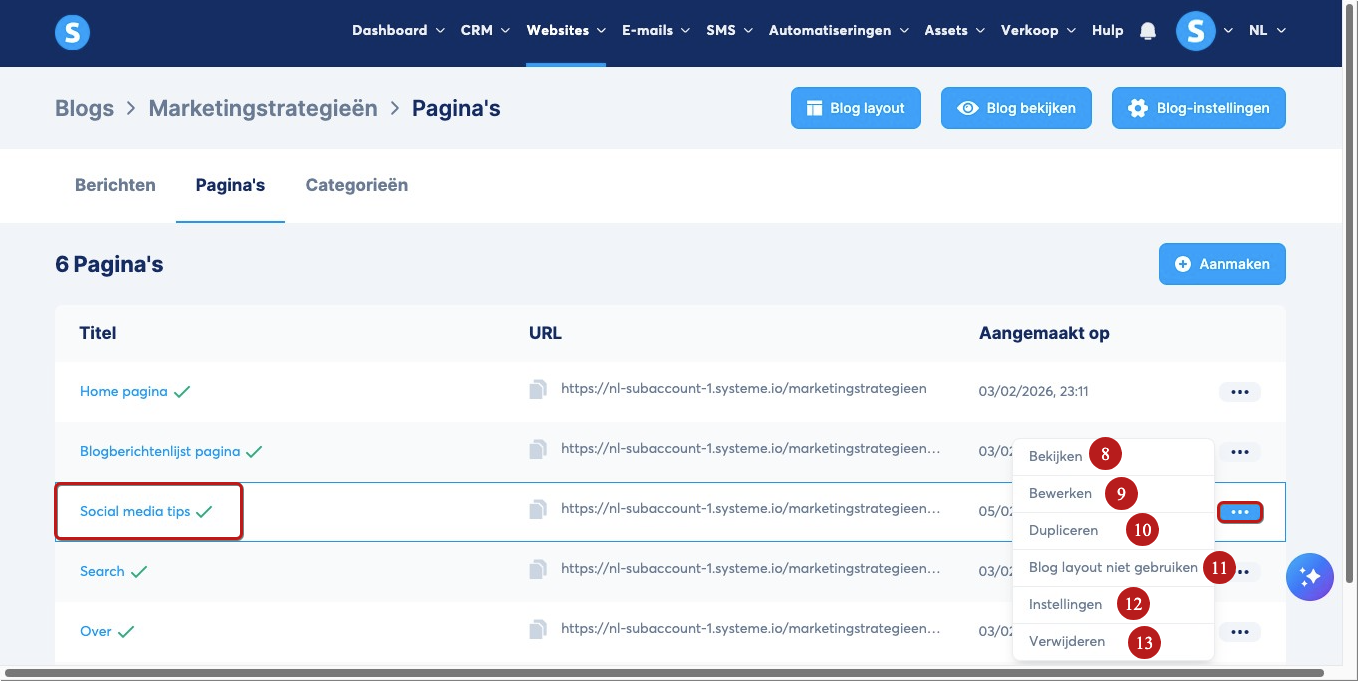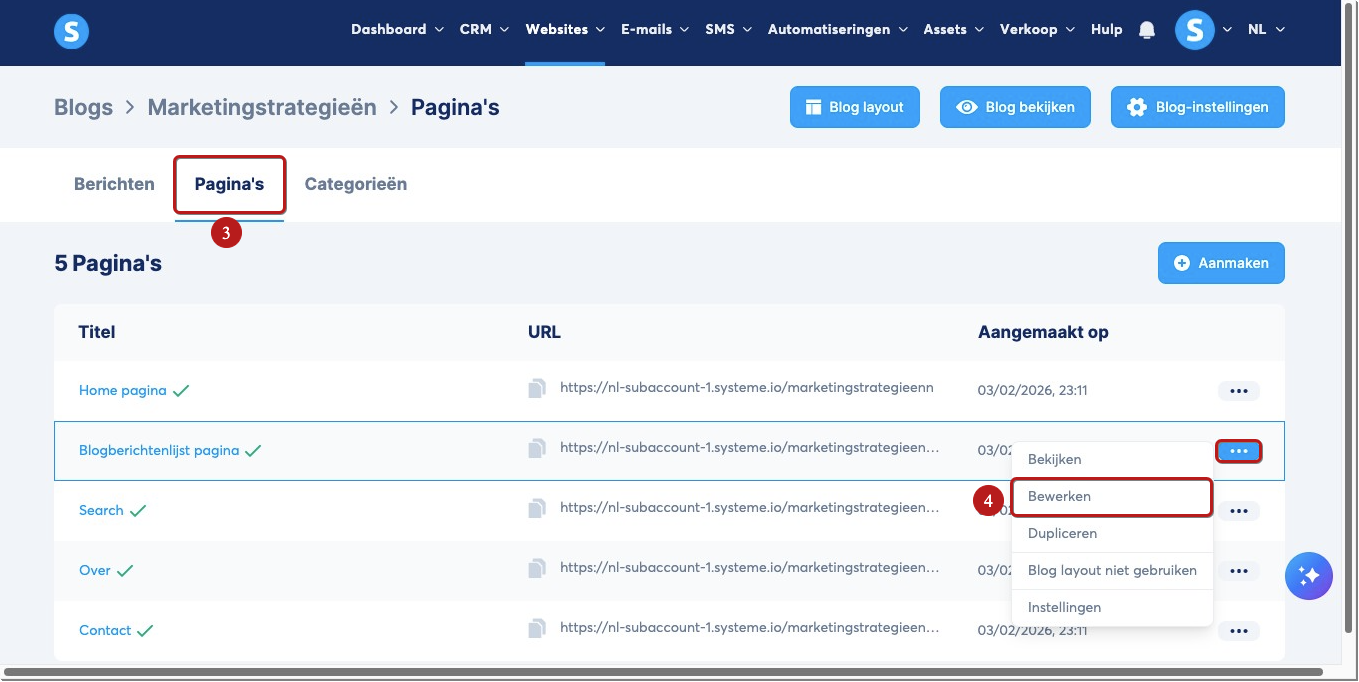 Wanneer je een nieuwe blog aanmaakt, genereert het systeem automatisch 5 voorbeeldpagina’s. Om deze te bewerken, klik je op de drie puntjes en selecteer je Bewerken (4).