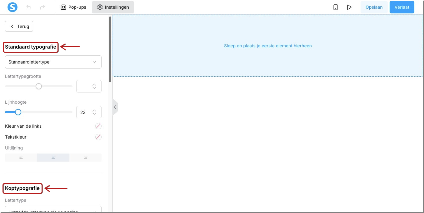 In de pagina‑editor kun je de standaardtypografie en koptypografie aanpassen en elementen naar de pagina slepen om deze te bewerken.