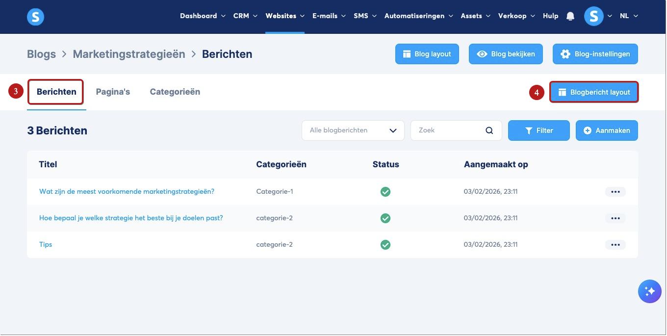 Ga in het menu van je blog naar de sectie Berichten (3) en klik vervolgens op Blogbericht layout (4).
