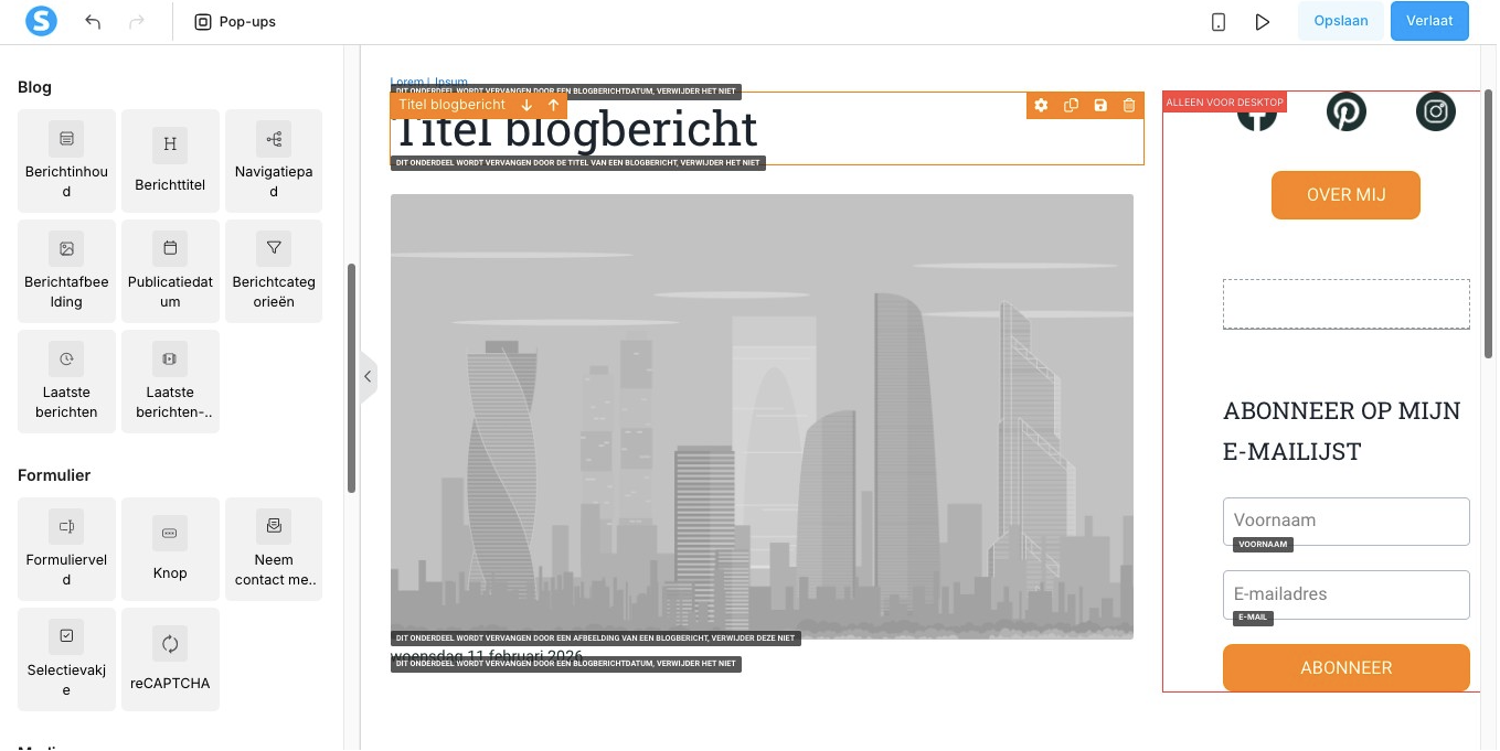 De post‑layout bepaalt de algemene structuur van je blogberichten. Het fungeert als een hoofdtemplate dat de positionering van content en de gemeenschappelijke elementen bepaalt die in al je blogposts terugkomen. Elk element dat je aan deze pagina toevoegt, verschijnt automatisch in elke post.