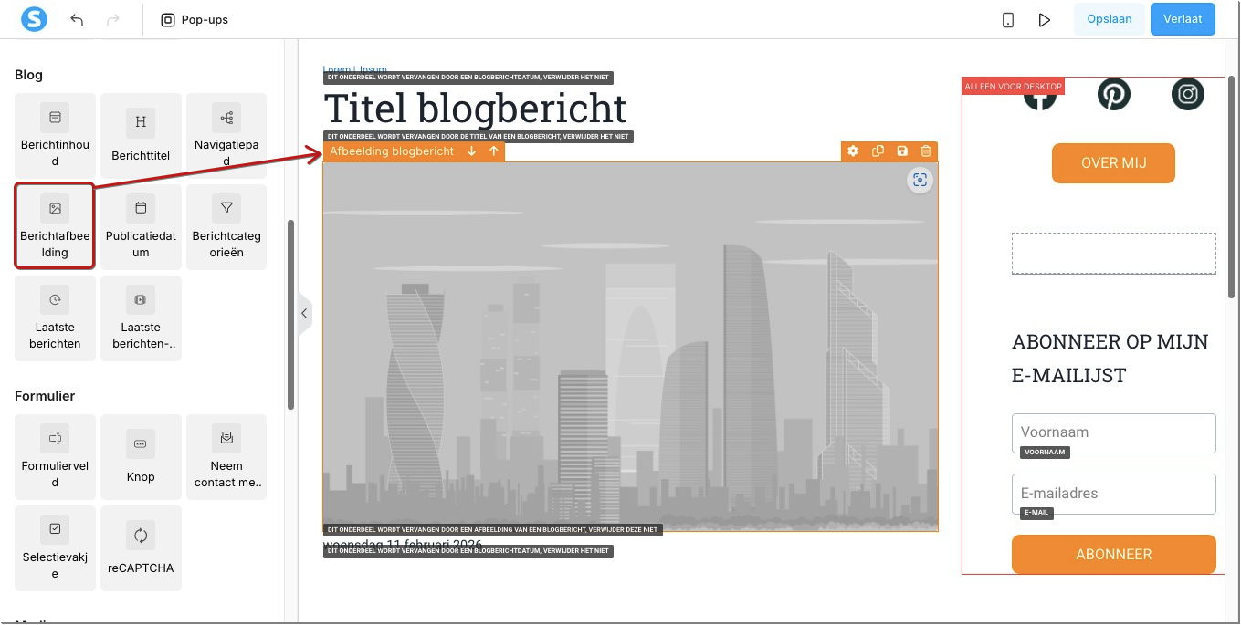 3. Afbeelding van het blogbericht: Dit element wordt automatisch vervangen door de omslagafbeelding die je hebt geüpload toen je de post aanmaakte.