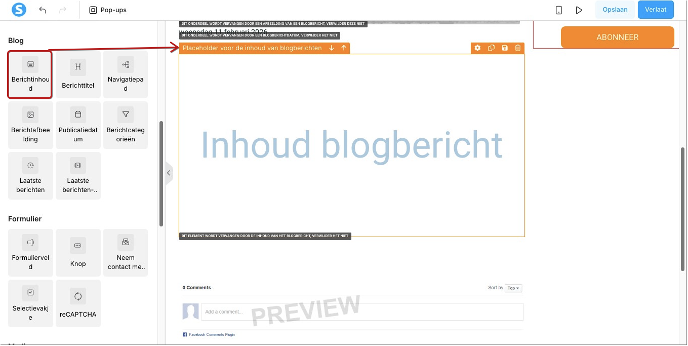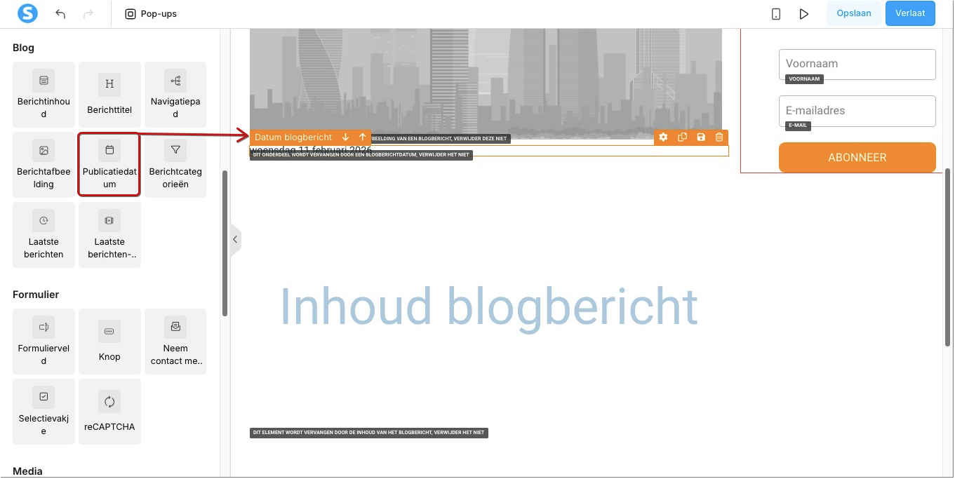 Om de publicatiedatum weer te geven, kun je het element Datum blogbericht toevoegen.