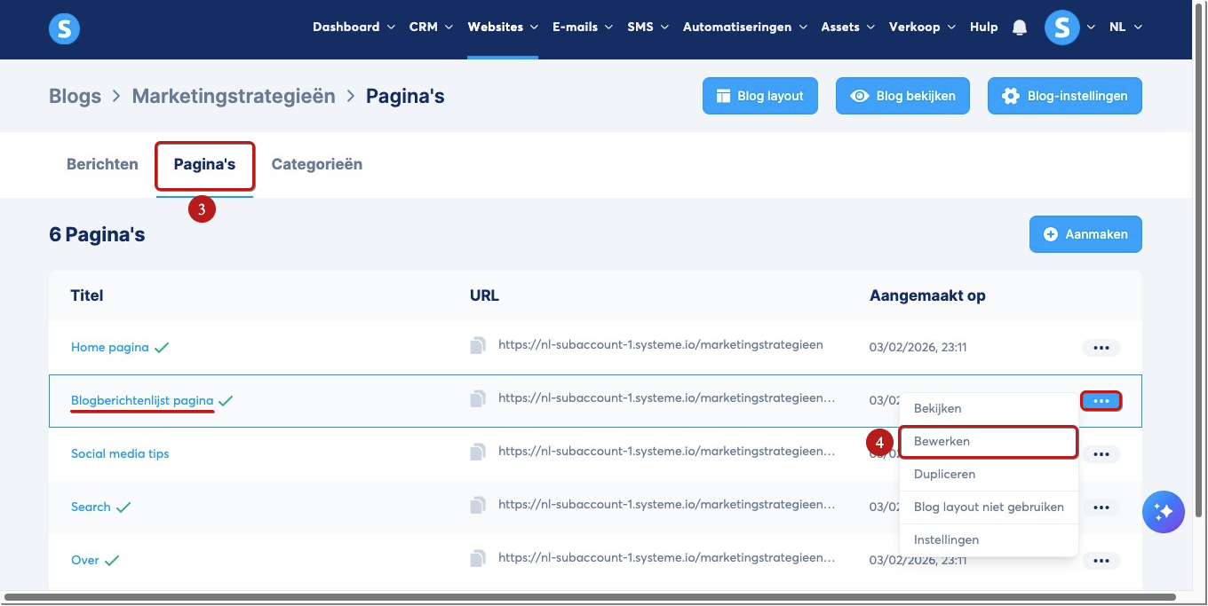 Klik in het menu van je blog op Pagina's (3) om de lijst met blogpagina’s te bekijken. Zoek de pagina met de titel Blogberichtenlijst pagina, klik op de drie puntjes (…) en klik op Bewerken (4).