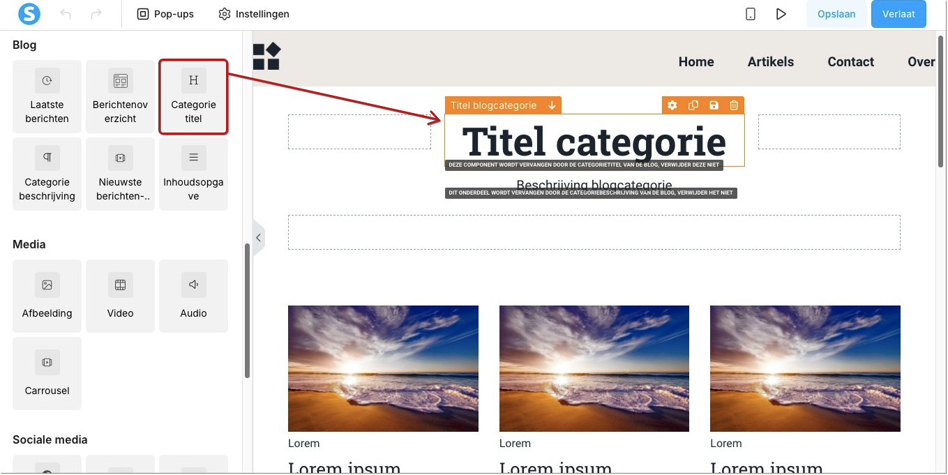 In de paginaeditor zie je in het linkerpaneel, onder de sectie “Blog”, de volgende pagina‑elementen: