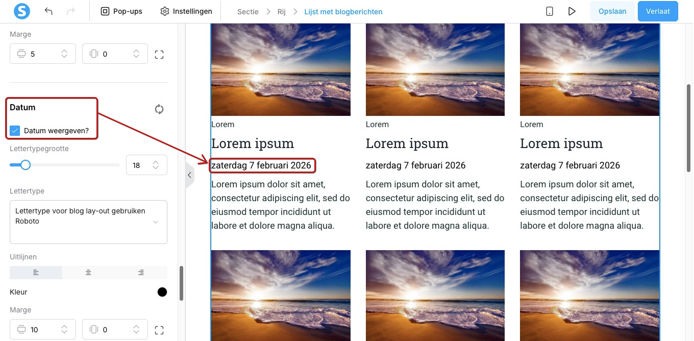 Om de zichtbaarheid van de publicatiedatum aan of uit te zetten, vink je het vakje ‘Datum weergeven?’ aan of uit in de sectie Datum.