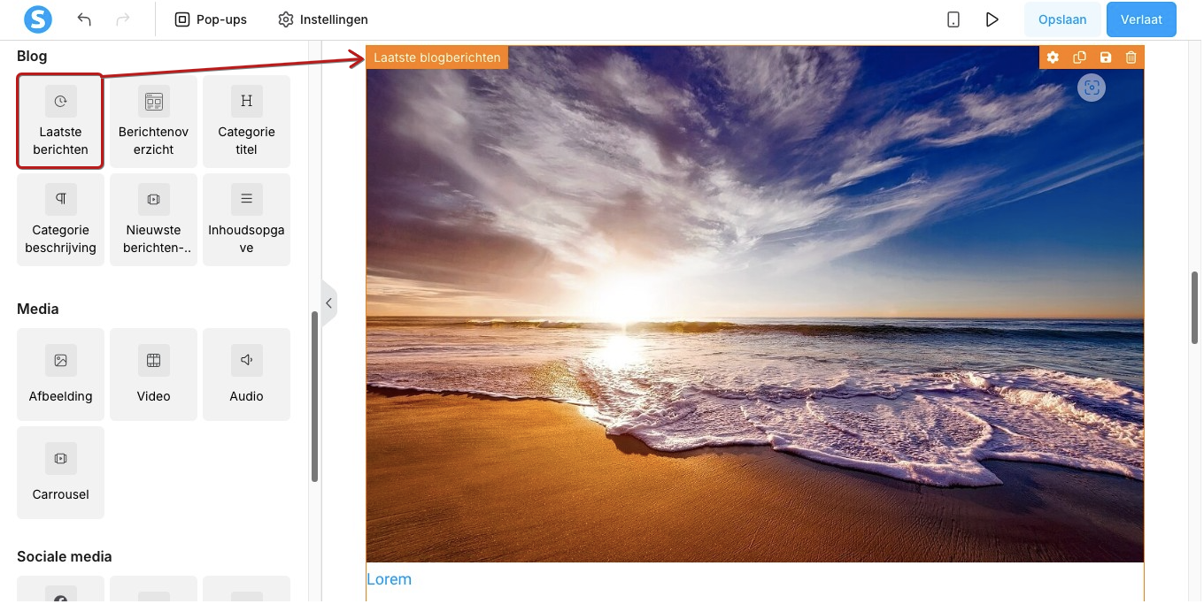 Via het instellingenpaneel aan de linkerkant, of door op het element Latest blog posts te klikken, kun je de volgende opties aanpassen: