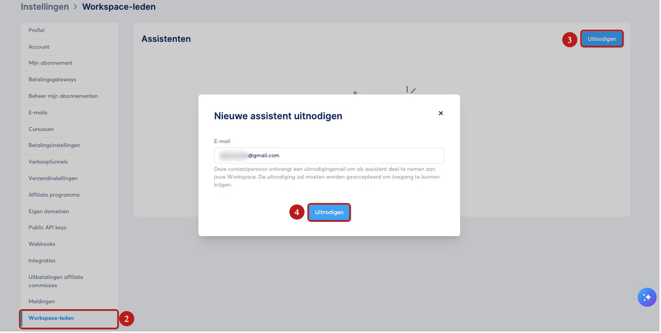 In het instellingenmenu klik je op Workspace‑leden (2). Klik vervolgens op Uitnodigen (3).