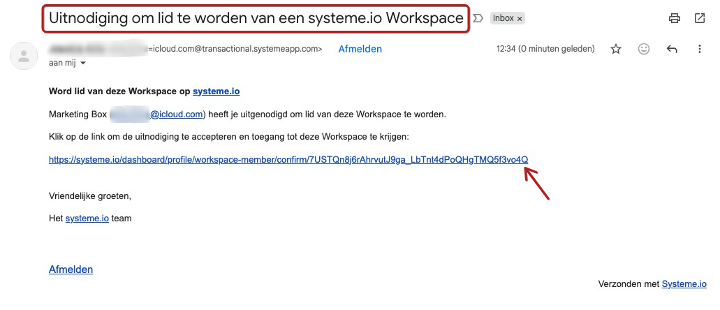 De assistent ontvangt een e‑mail met de titel Uitnodiging om lid te worden van een systeme.io-workspace. Ze hoeven alleen op de bevestigingslink in de e‑mail te klikken om toegang te krijgen tot jouw workspace.
